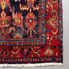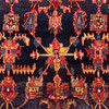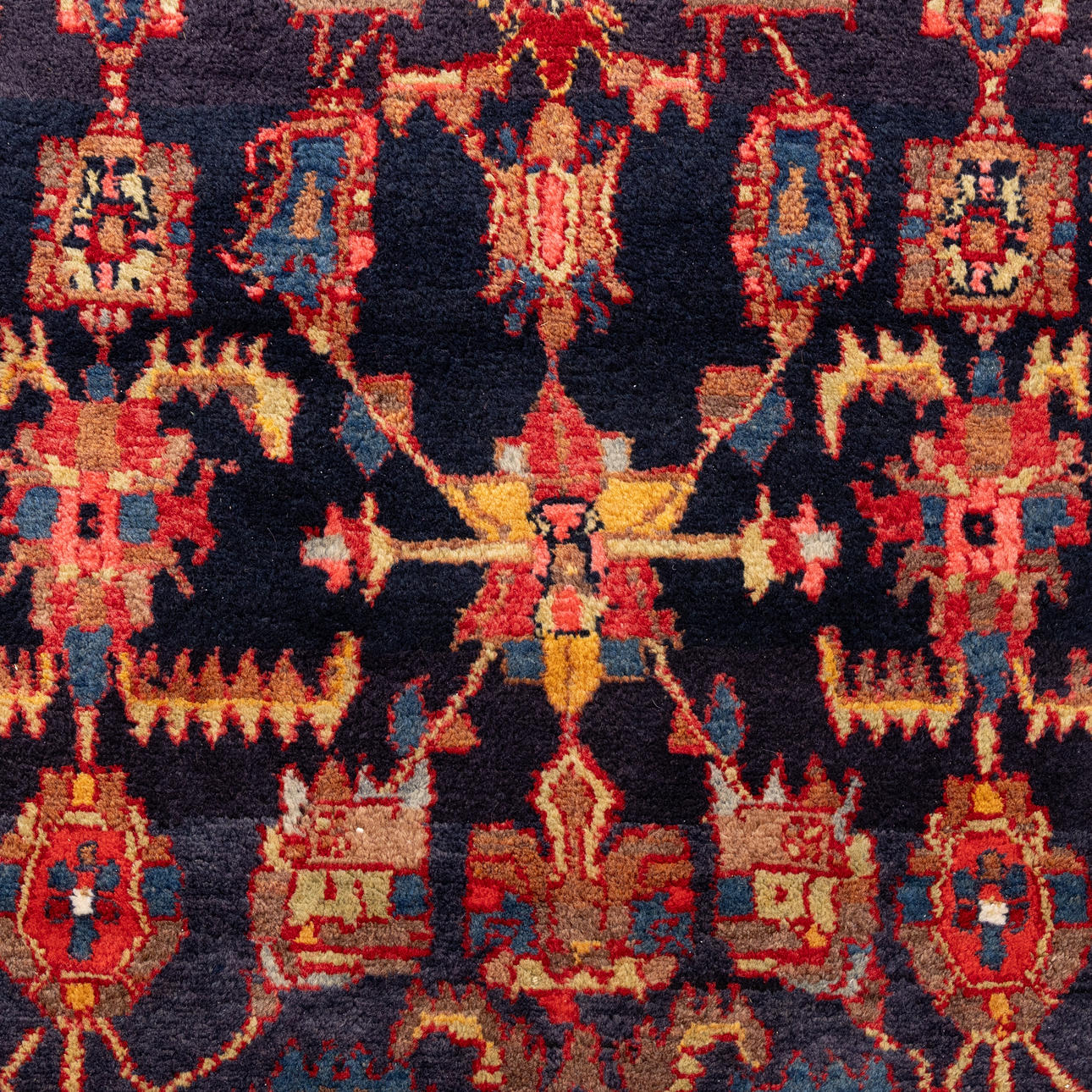 Handgeknüpfter Wollteppich auf Baumwollkette, geometrisches Muster auf dunkelblauem Grund.