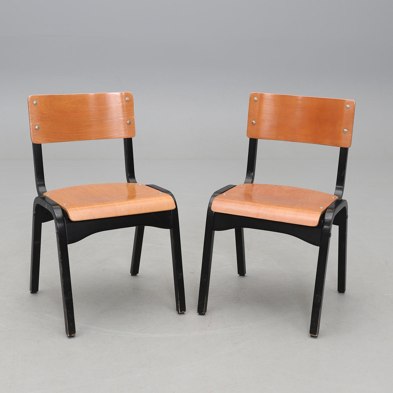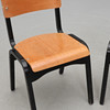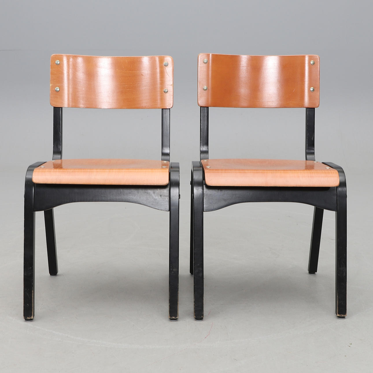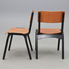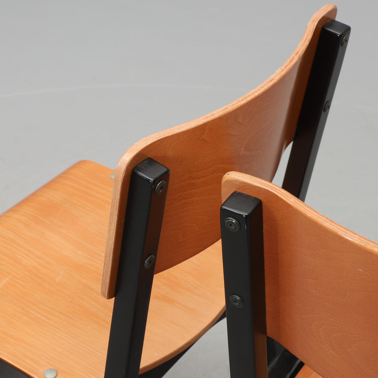 Stapelbar Rückenlehne und Sitz aus Sperrholz, schwarz lackierter Holzrahmen. Breite 48, Tiefe 42, Höhe 82 cm.