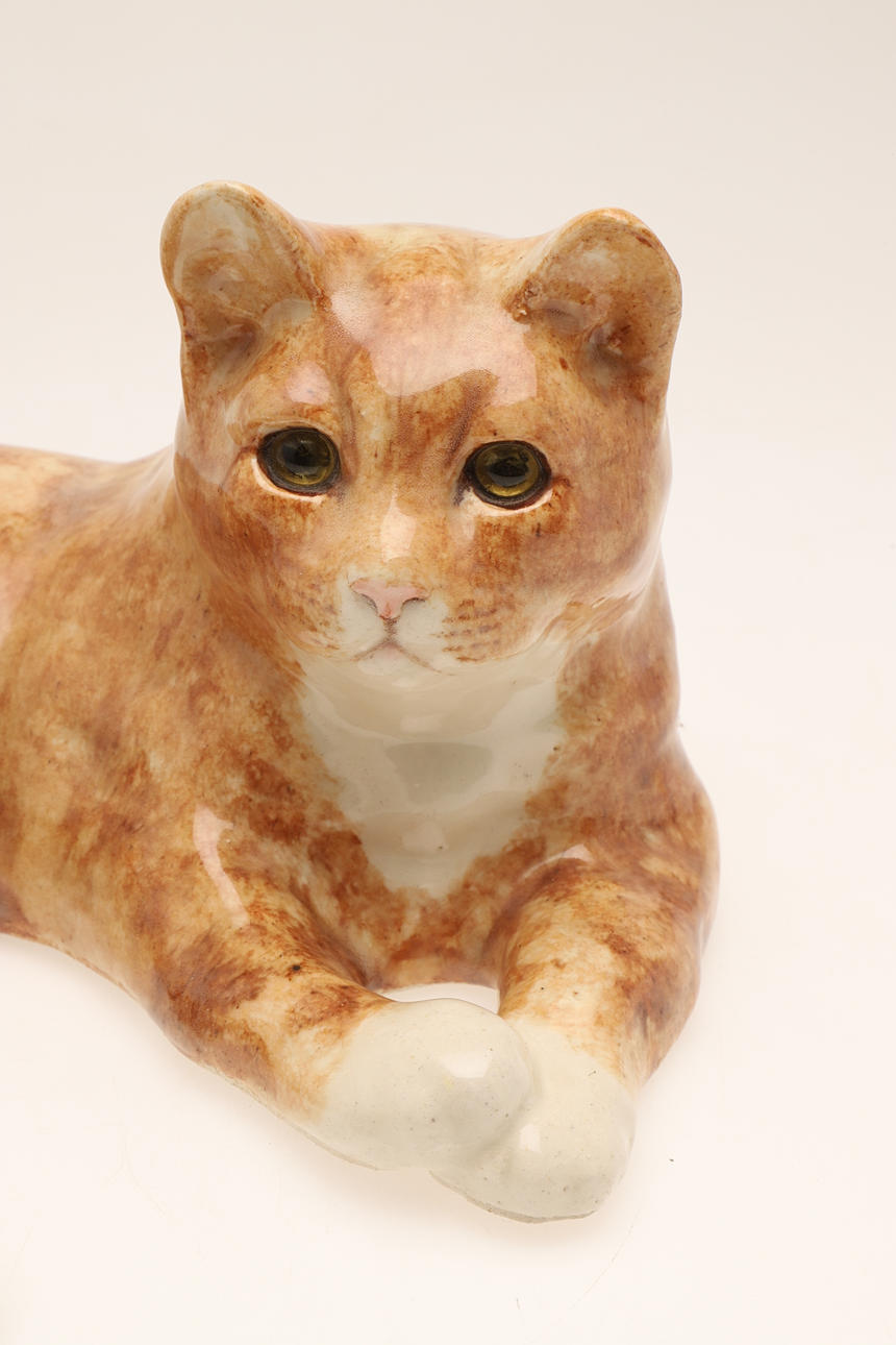 in liegender Pose modelliert, mit gelben Glasaugen, bemalte Keramikspuren auf der Unterseite, 17 cm hoch, 37 cm breit, 30 cm tief.
