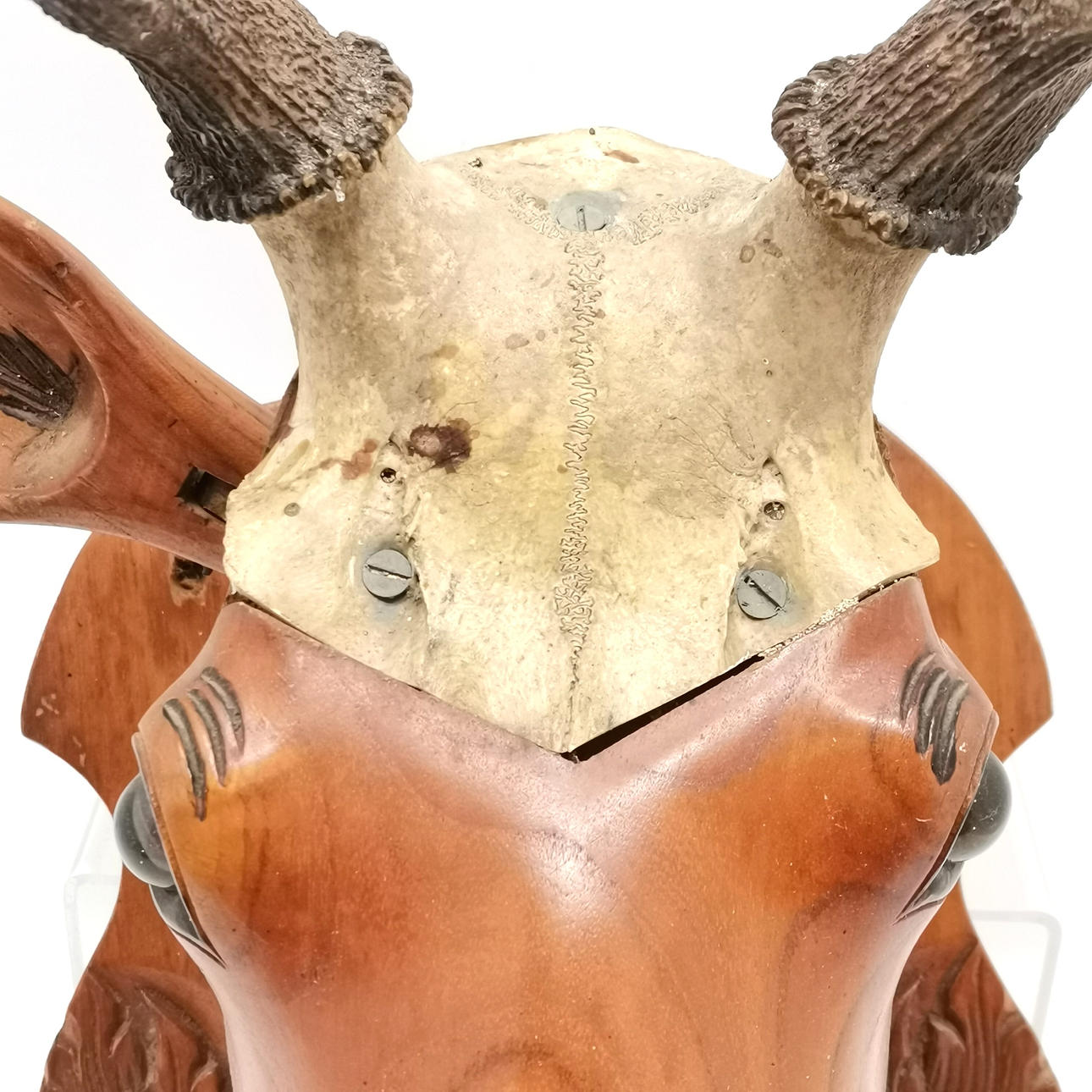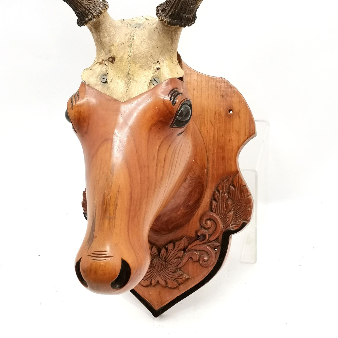 4411082. GESCHNITZTER, LEBENSGROSSER TROPHÄENHIRSCHKOPF AUS HOLZ.