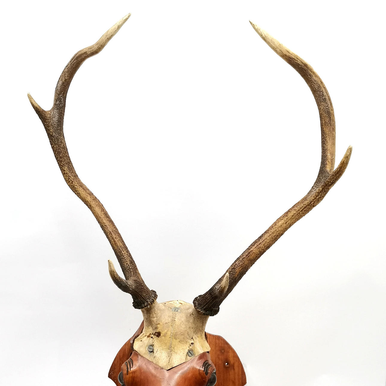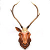 Geschnitzter, lebensgroßer Trophäenhirschkopf aus Holz mit 6 spitzen Hirschhörnern, ca. 100 cm hoch x 58 cm breit.