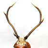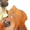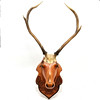 GESCHNITZTER, LEBENSGROSSER TROPHÄENHIRSCHKOPF AUS HOLZ.