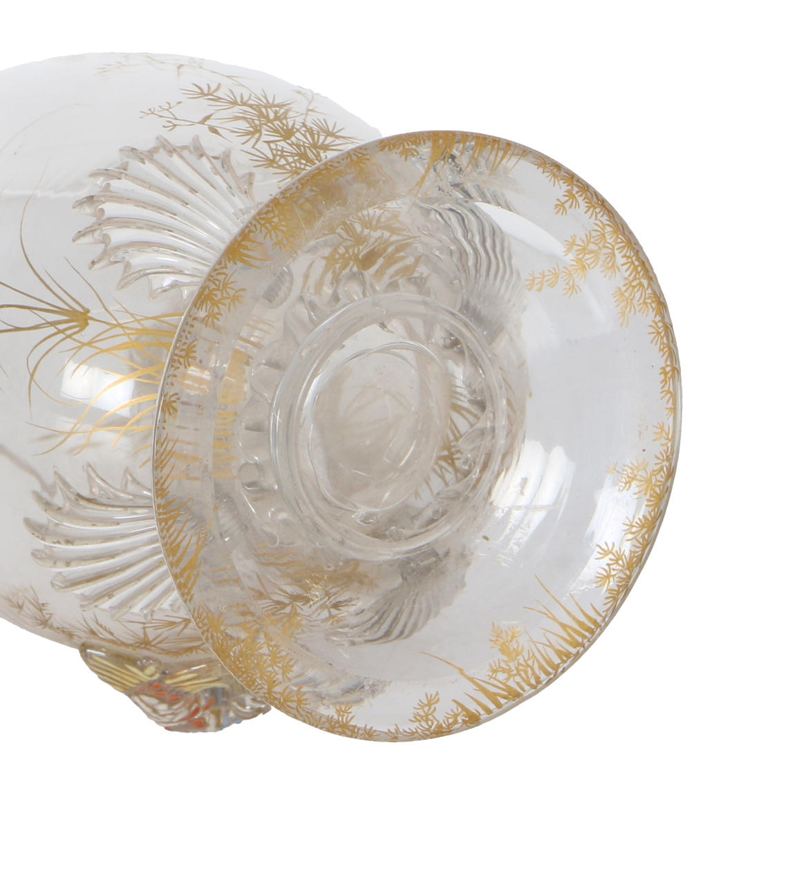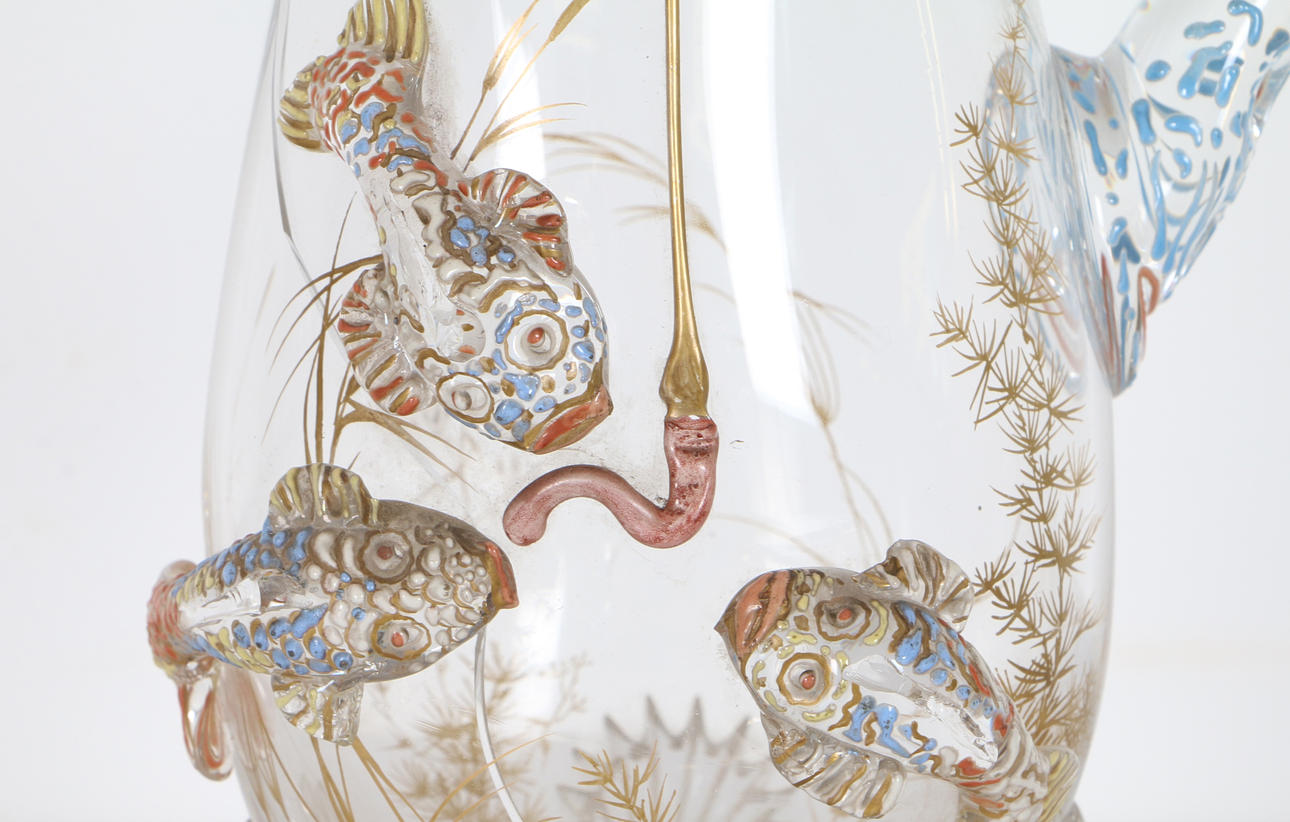 In eiförmiger Form, dekoriert von Jules Barbe mit aufgetragenen Glaskarpfenfischen mit vergoldeten Schilf- und Blattmalereien an Körper und Fuß.