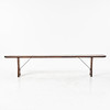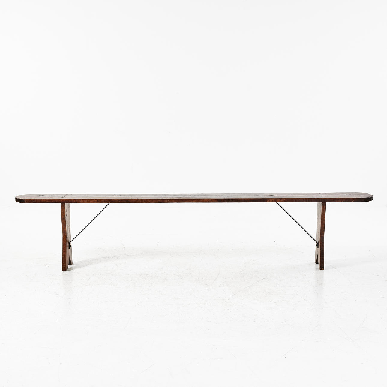 Eine Eichenbank aus dem 20. Jahrhundert mit Eisenstreben.