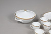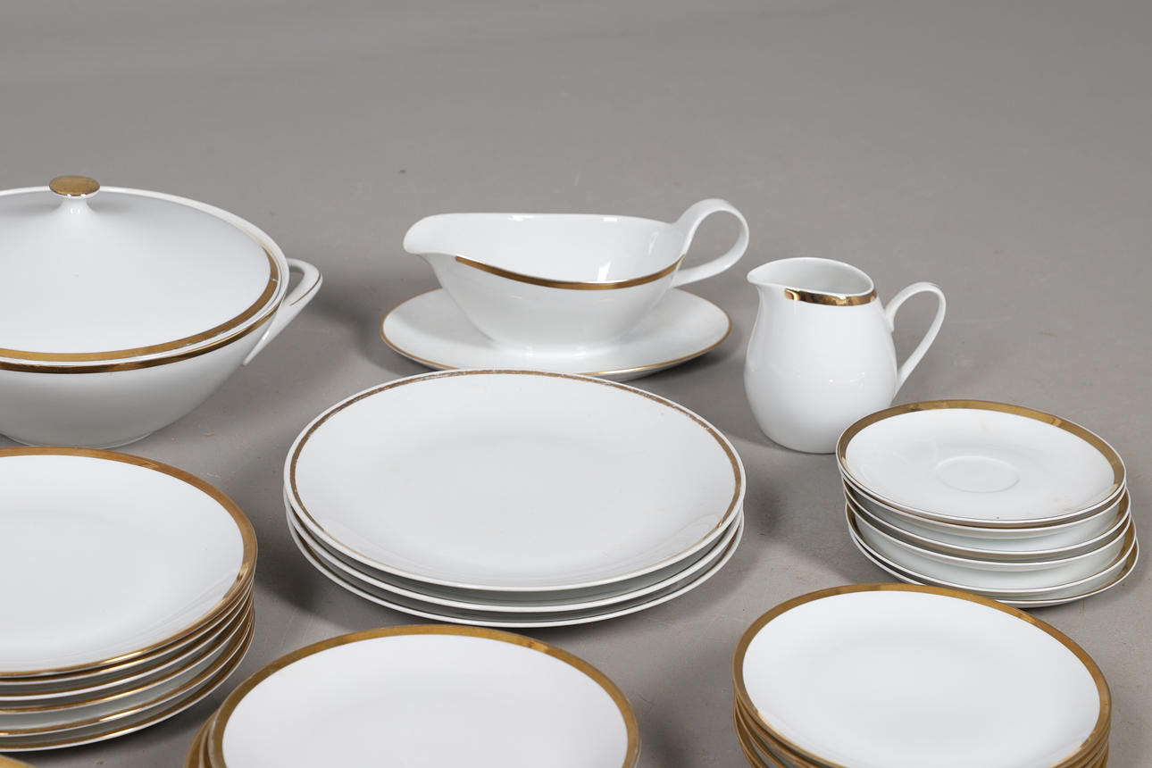 inklusive Speisetellern, Beilagentellern, Desserttellern, zwei abgedeckten Terrinen, Tassen und Untertassen, Sauciere und Standfuß sowie einem Milchkännchen (Menge).
