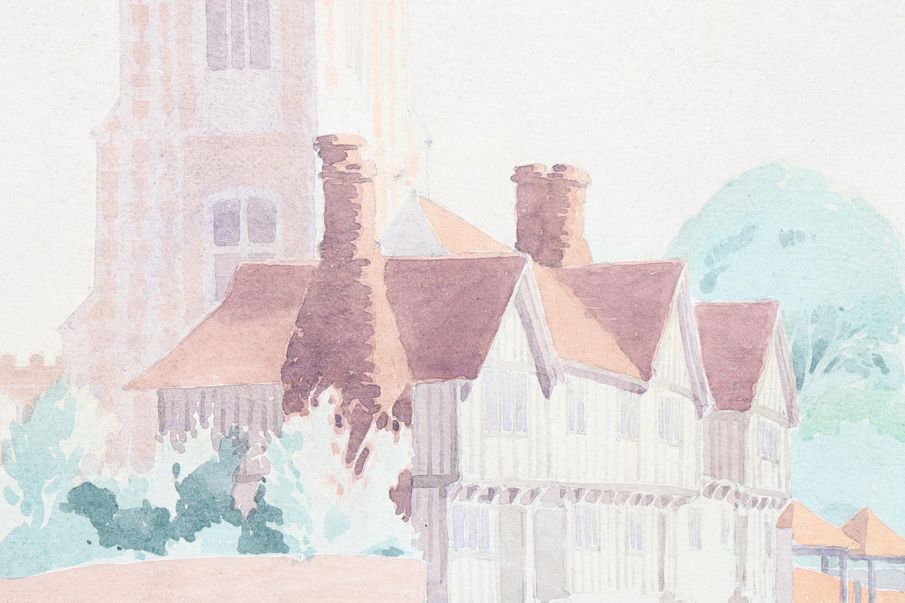 Das unsignierte und ungerahmte Aquarell, das eine Häuserreihe vor einer Kirche in Suffolk darstellt und Paul Smythe zugeschrieben wird, ist 37,5 cm x 26,5 cm groß.