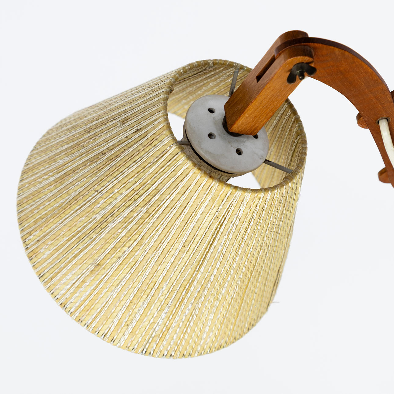 In Teakholz. Eine Brennstelle, E27 Fassung. Lampenschirm aus Bändern gespannt.