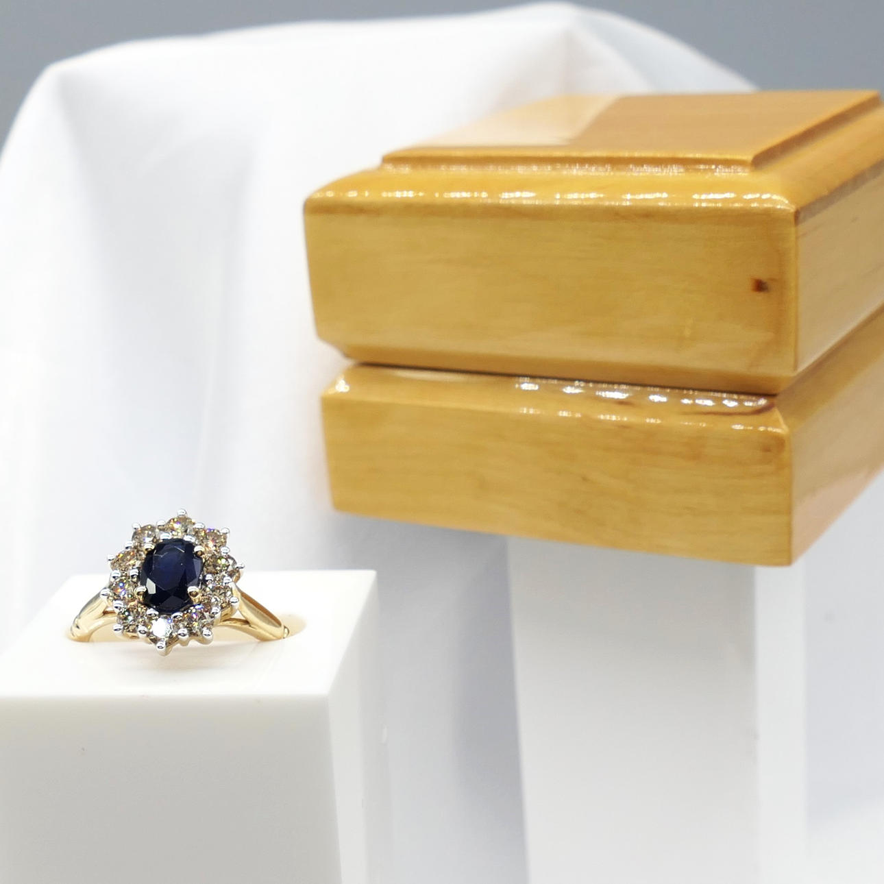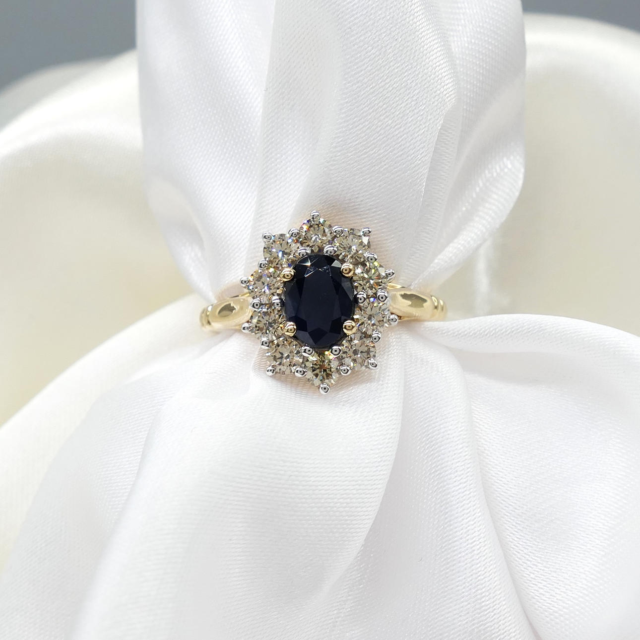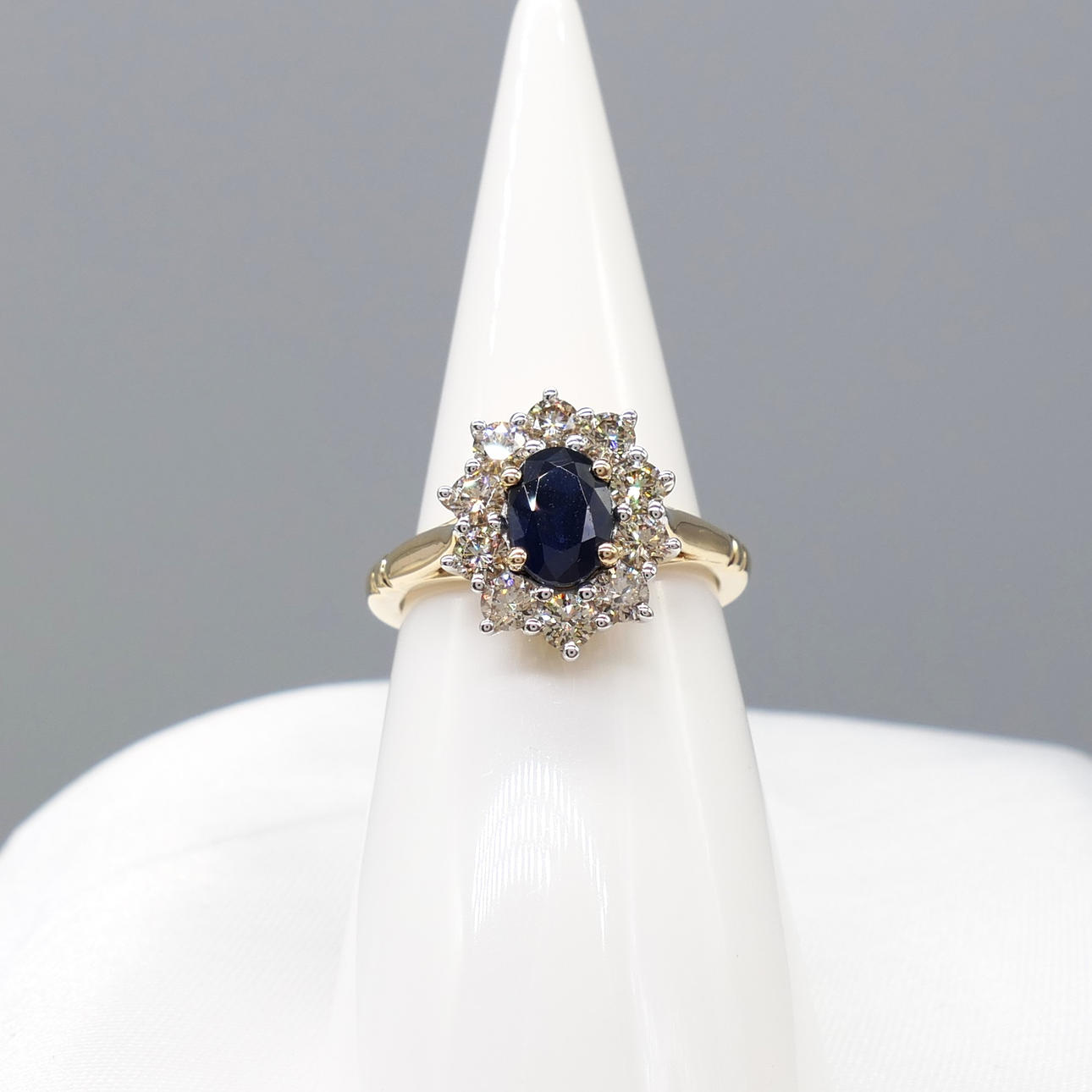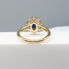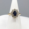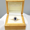 Ein ovaler Clusterring mit blauem Saphir und runden Diamanten im Brillantschliff, mit Geschenkverpackung