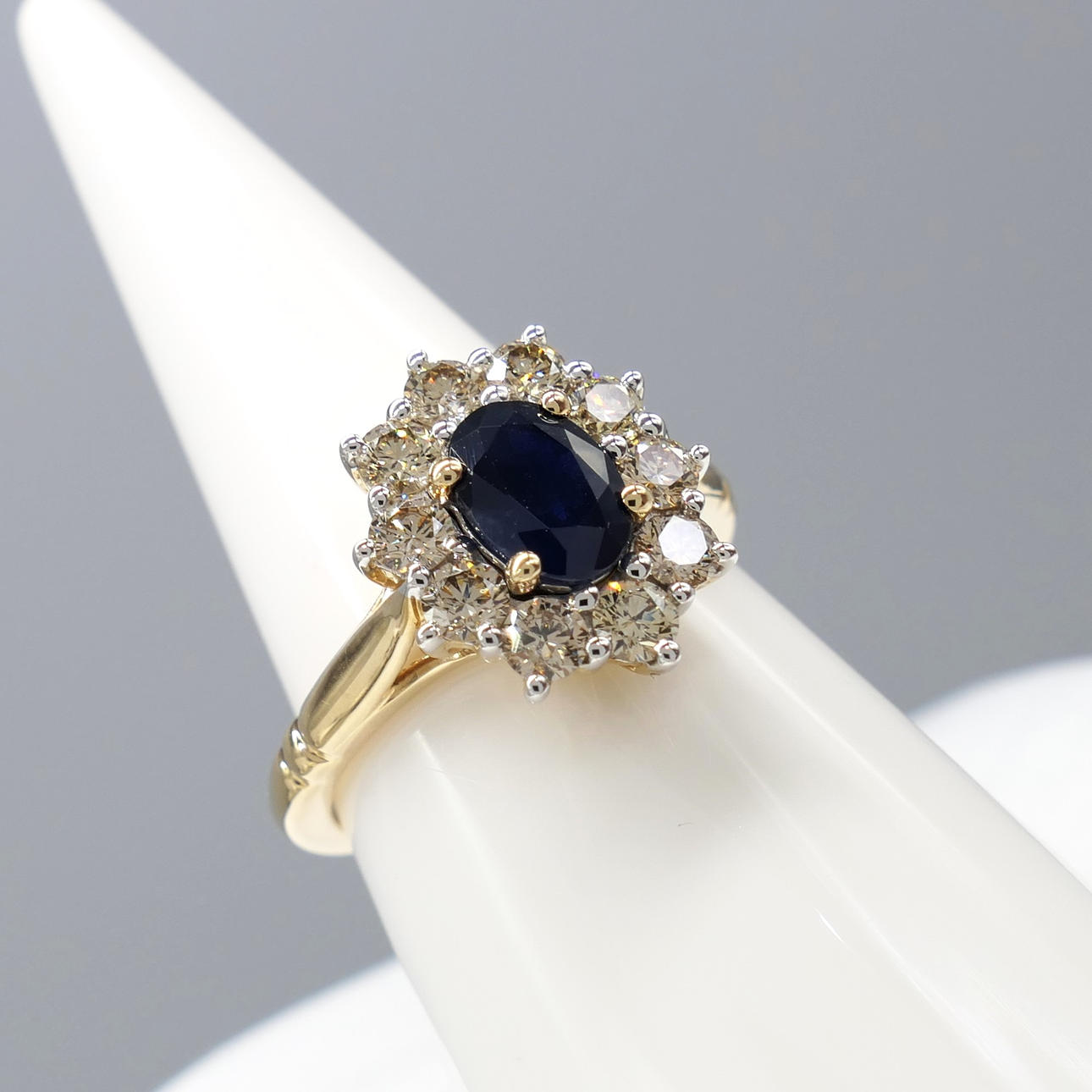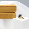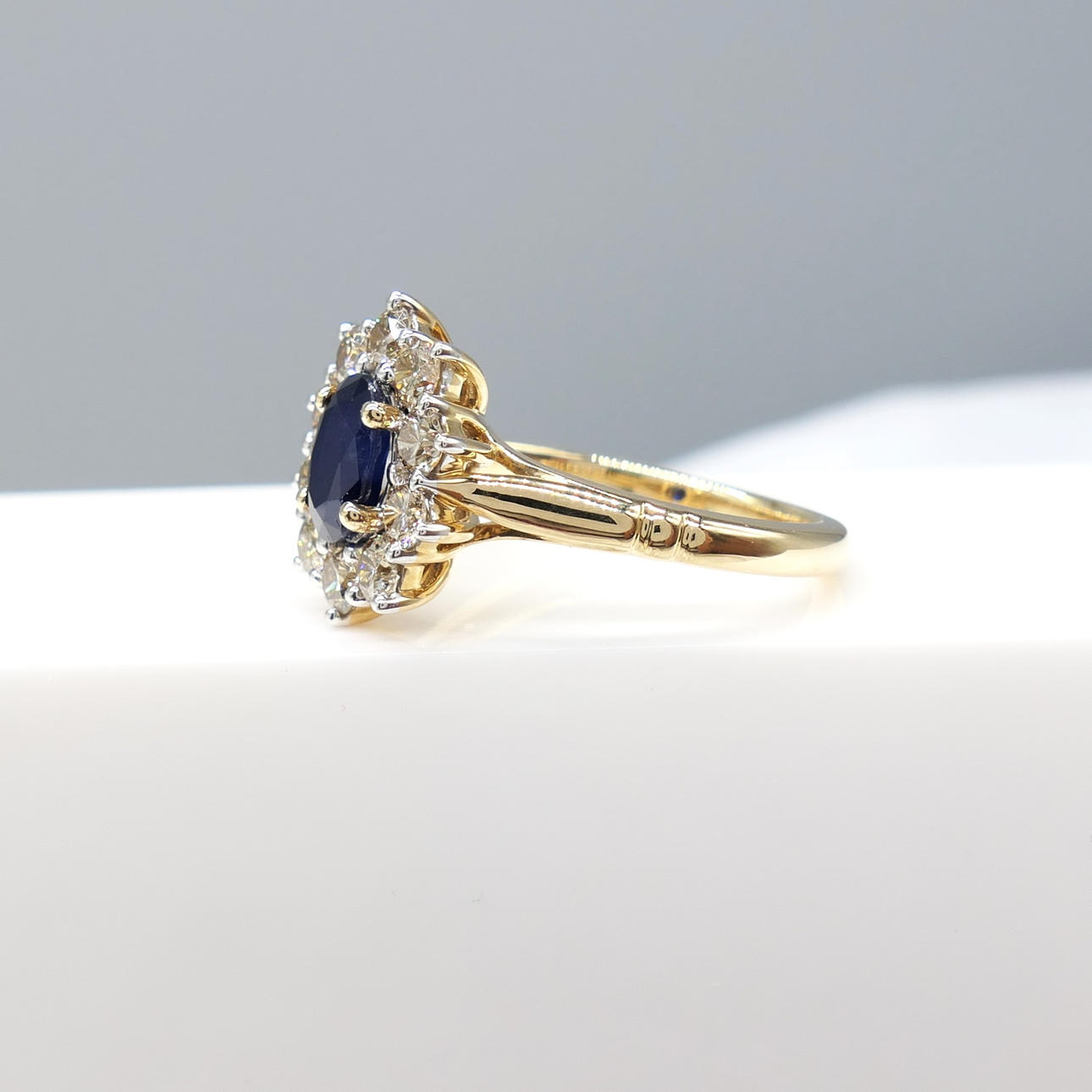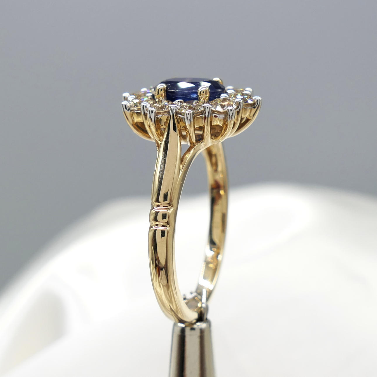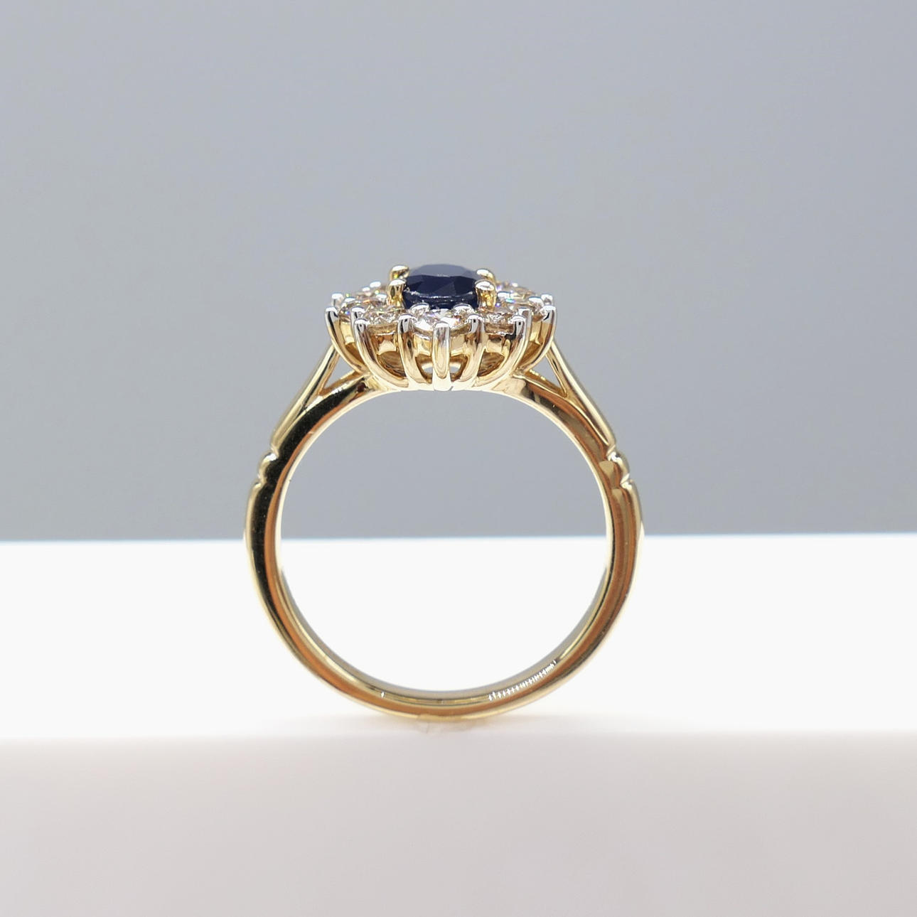 Ein ovaler Clusterring mit blauem Saphir und runden Diamanten im Brillantschliff, mit Geschenkverpackung