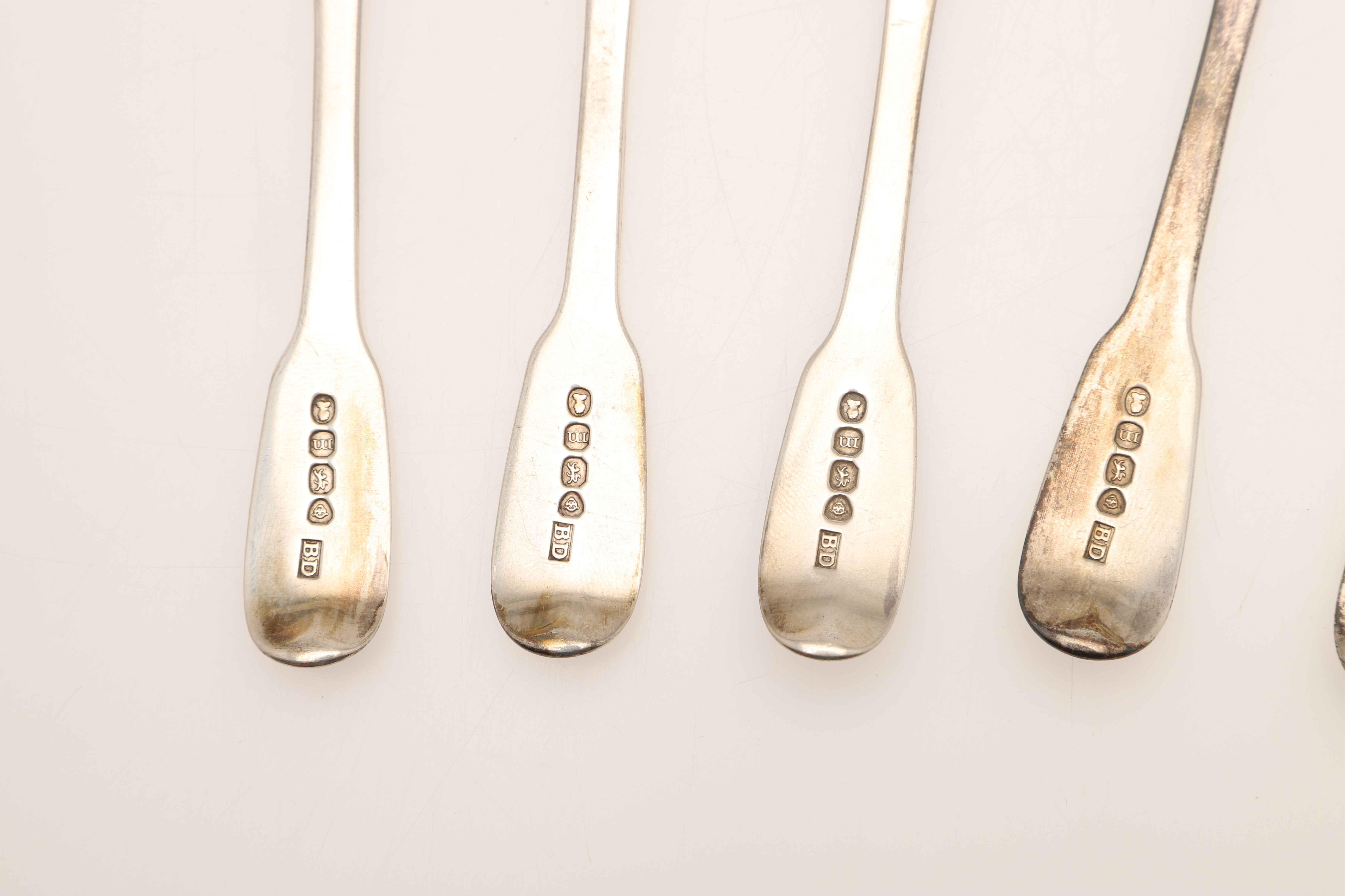 4435838. EIN SATZ VON SECHS SILBERNEN TEELÖFFELN MIT GEORGE IV-GEIGENMUSTER.