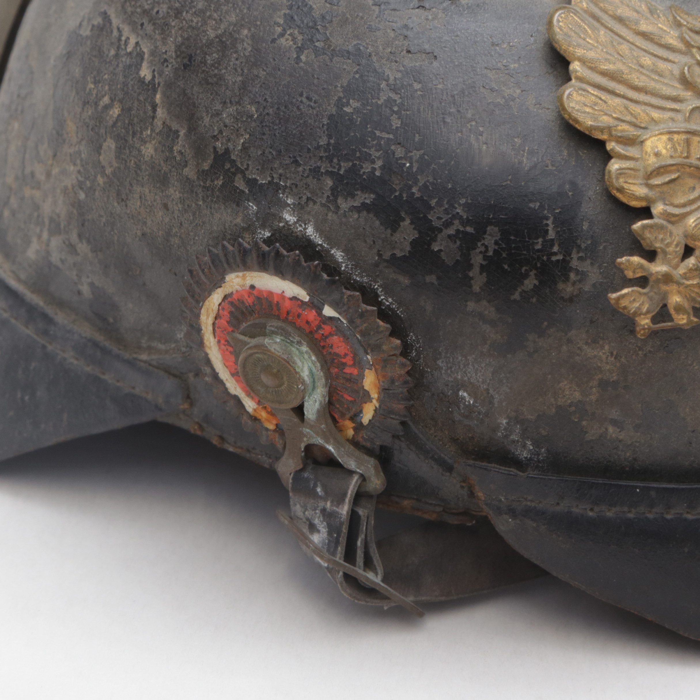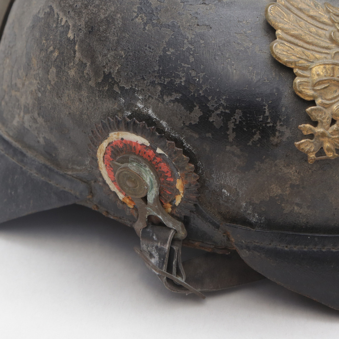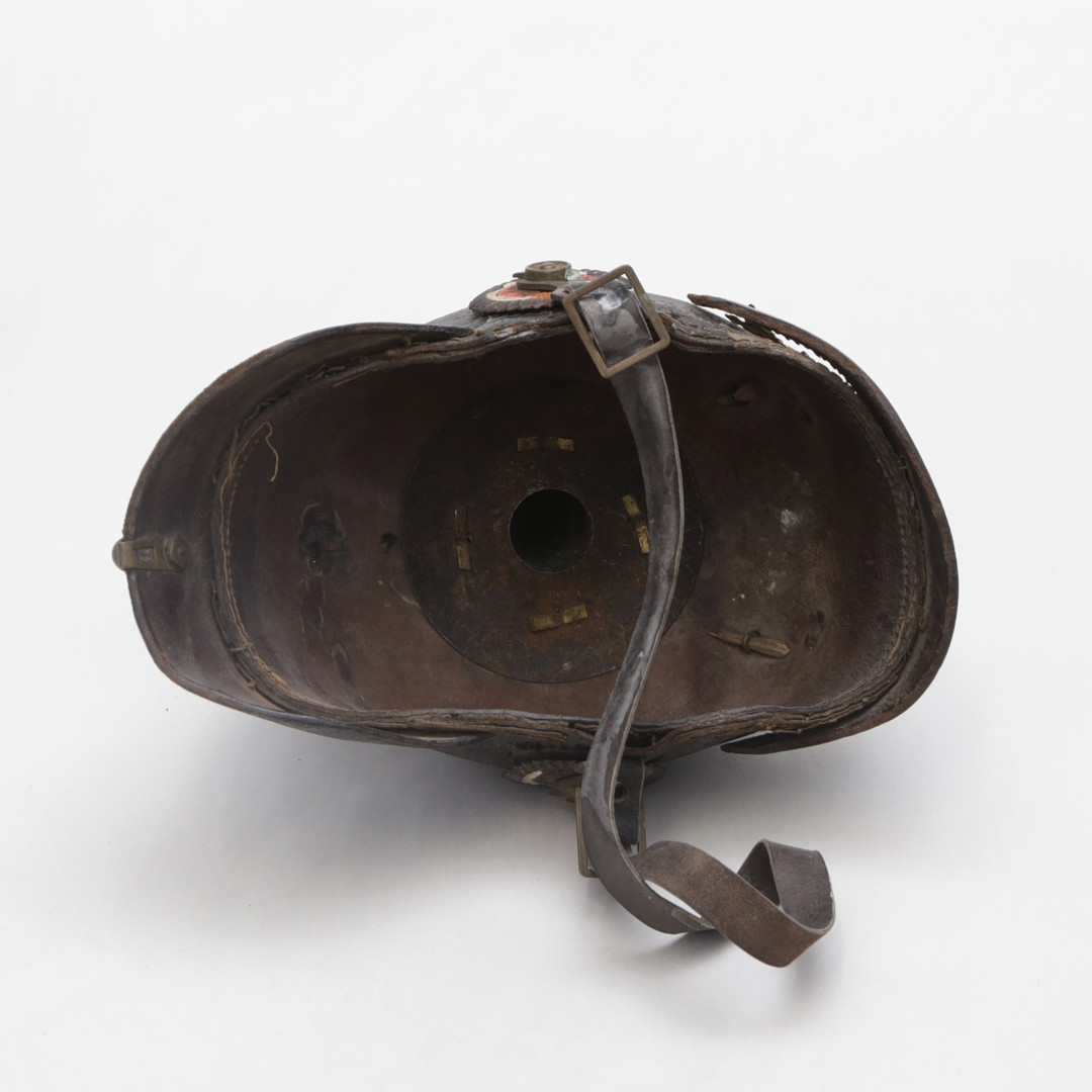 4452654. Kapuze aus Leder/Metallgurken/Helm, Preußen.