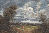 Figur in einer Landschaft mit Bäumen im Vordergrund,