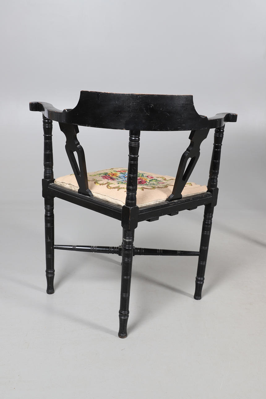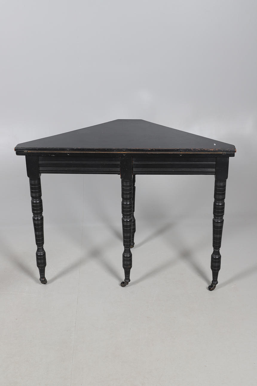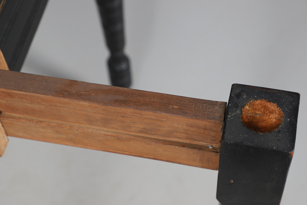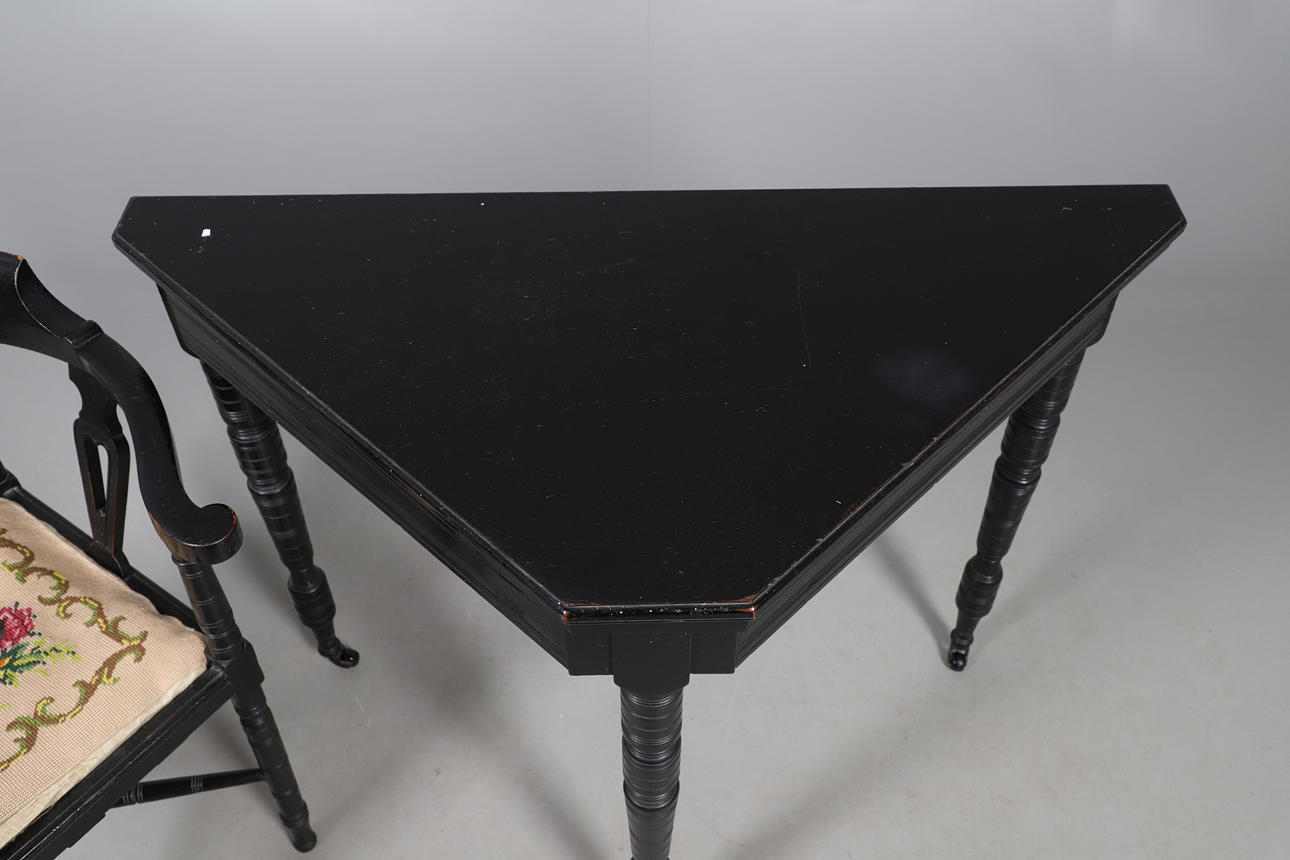 EIN EBONISIERTER KARTENTISCH VON EDWARDS UND ROBERTS UND EIN EBONISIERTER ECKSTUHL.