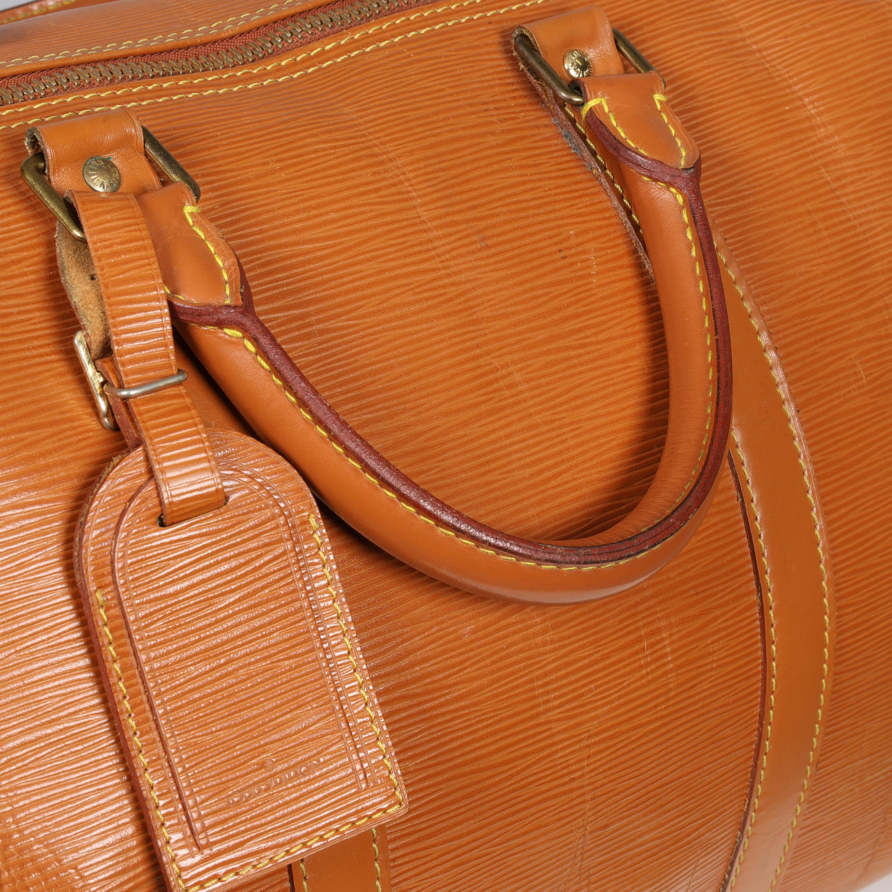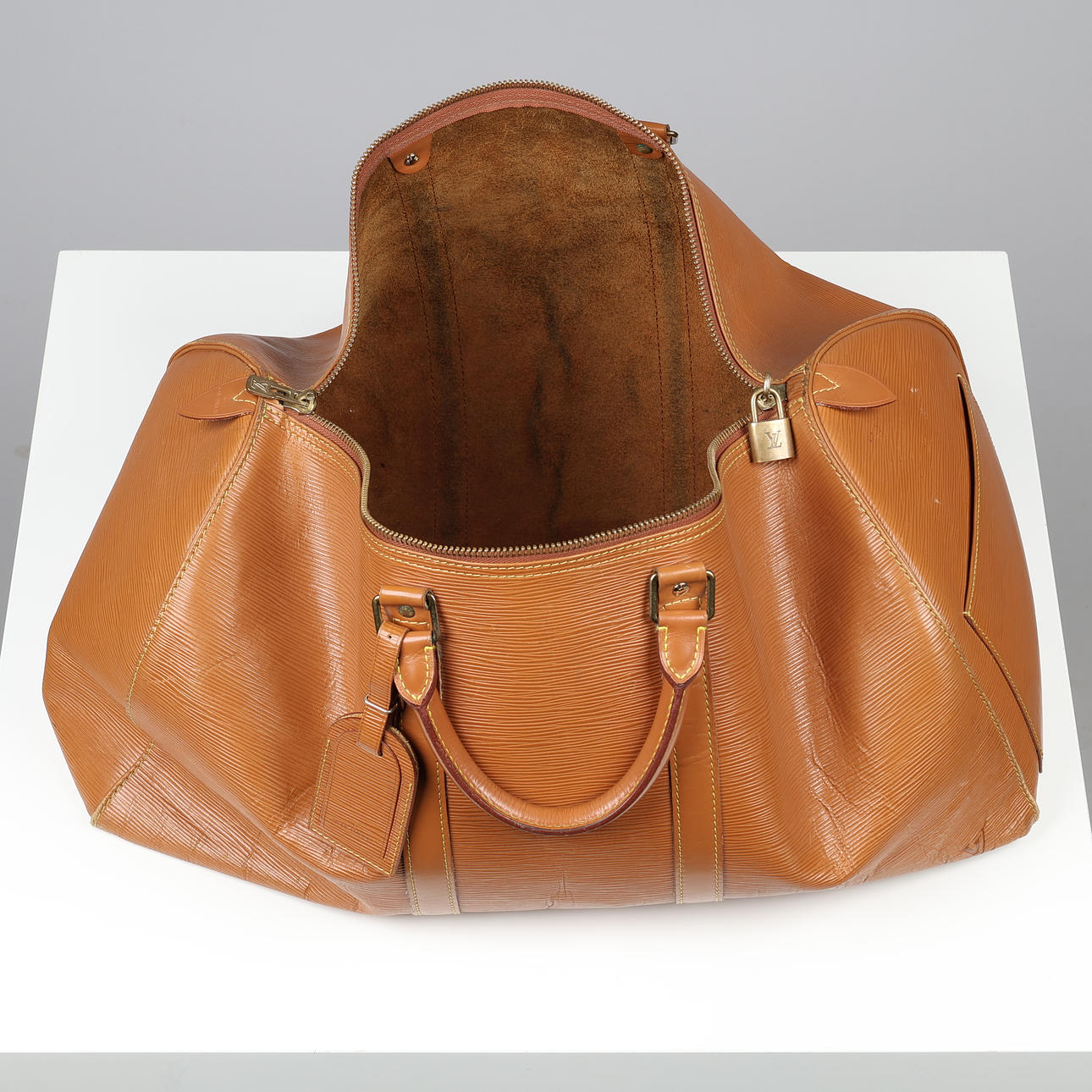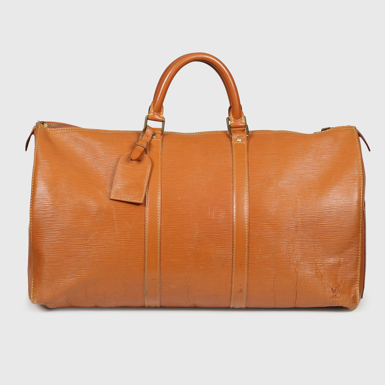Louis Vuitton Wochenendtasche aus cognacfarbenem Épi-Leder, innen ein großes Fach, kleine Außentasche, Kofferanhänger und Vorhängeschloss ohne Schlüssel. Mit 50 (Größe 50) und VI (Frankreich) 1900 (10/1990) gekennzeichnet. H.28 x 51 x 26 cm, letztes Maß in der Mitte.