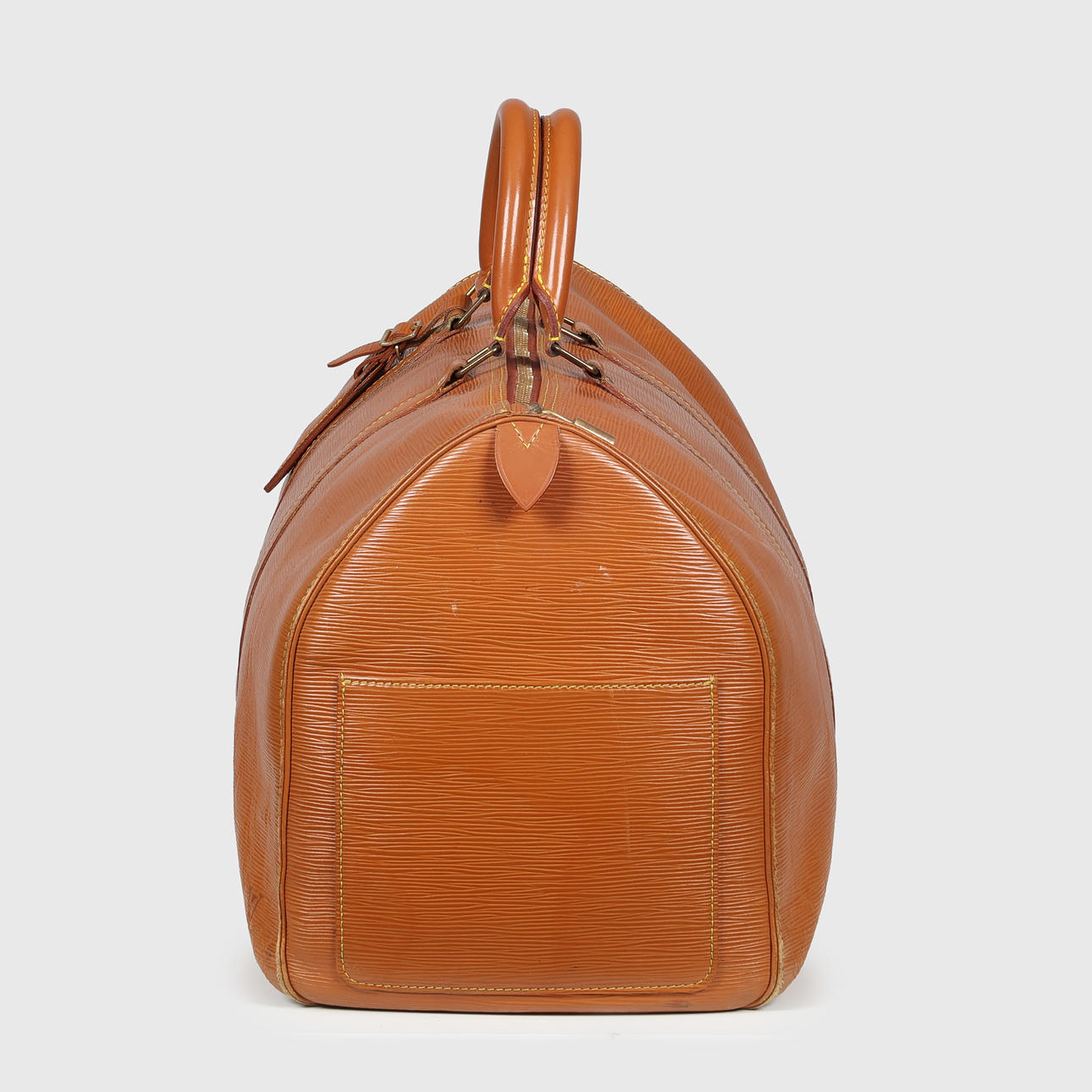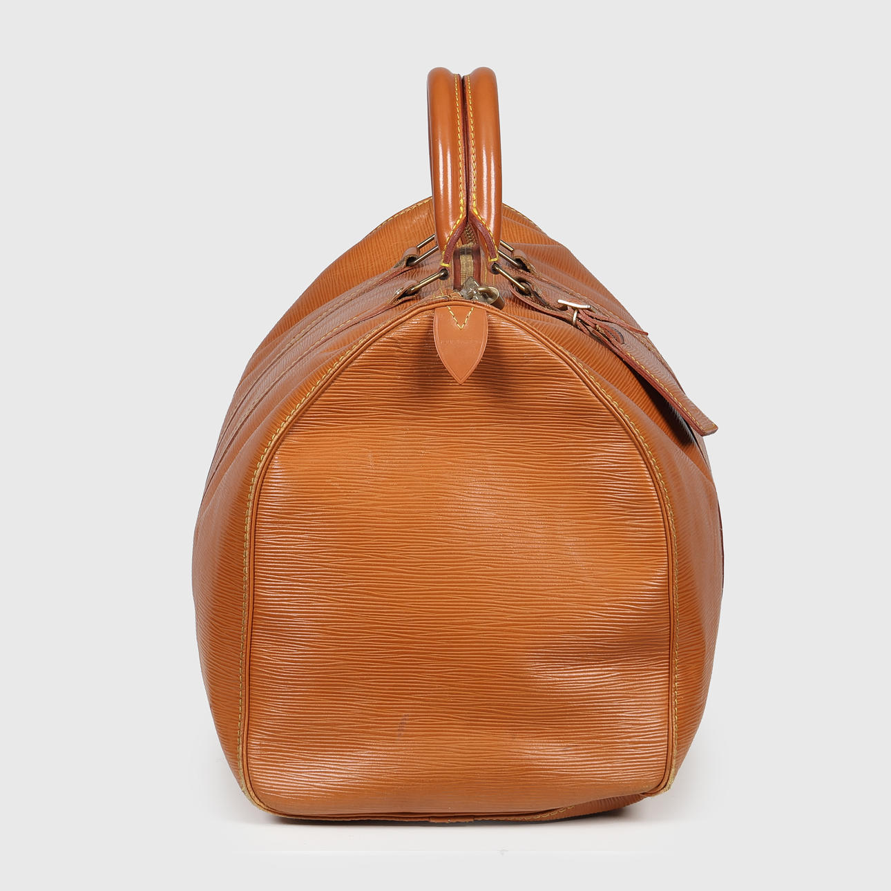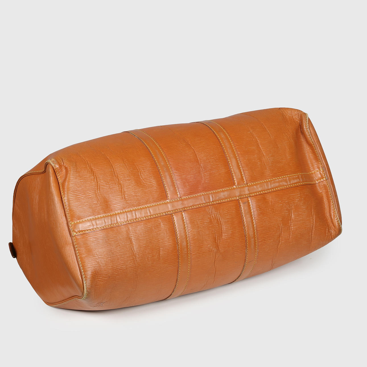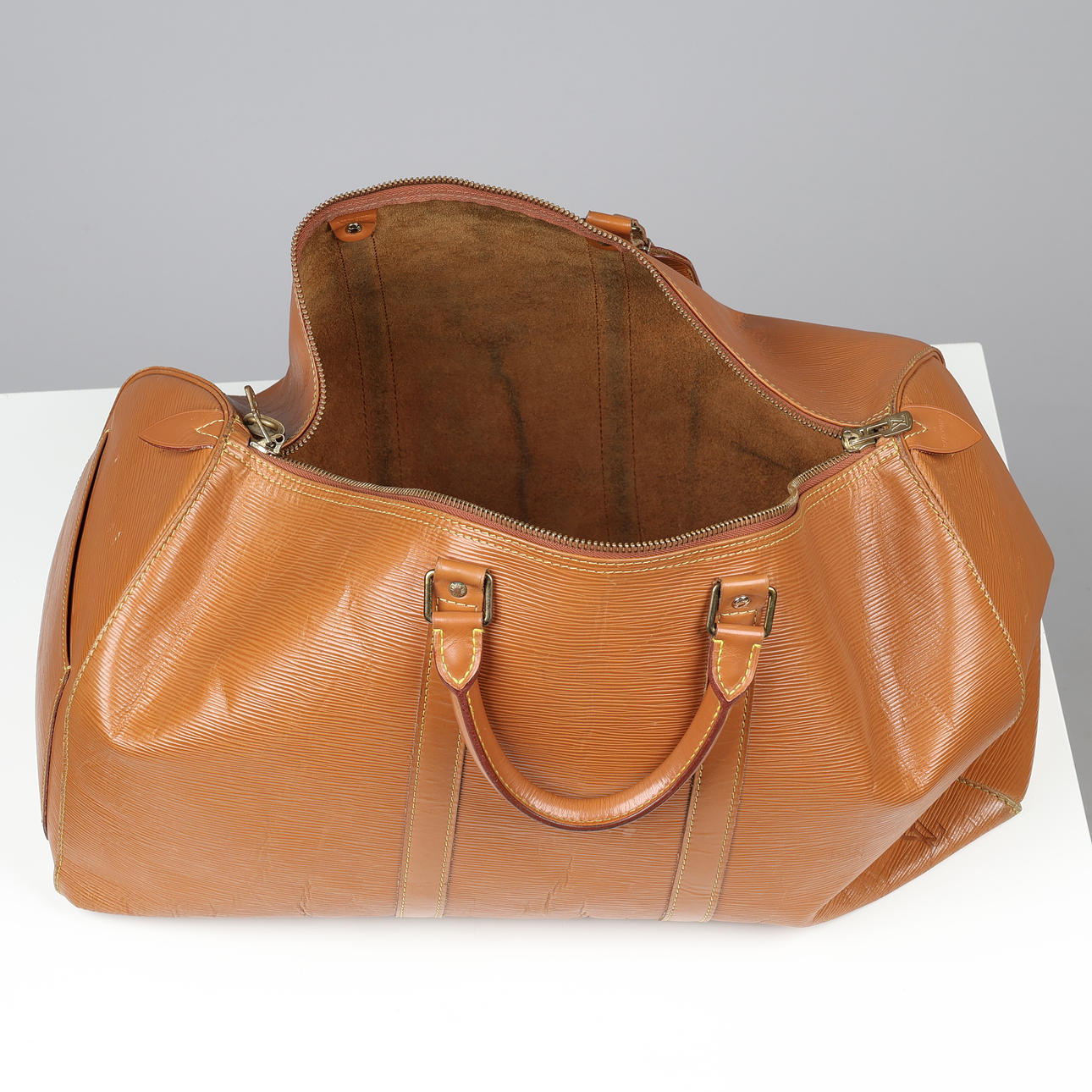 Louis Vuitton Wochenendtasche aus cognacfarbenem Épi-Leder, innen ein großes Fach, kleine Außentasche, Kofferanhänger und Vorhängeschloss ohne Schlüssel. Mit 50 (Größe 50) und VI (Frankreich) 1900 (10/1990) gekennzeichnet. H.28 x 51 x 26 cm, letztes Maß in der Mitte.