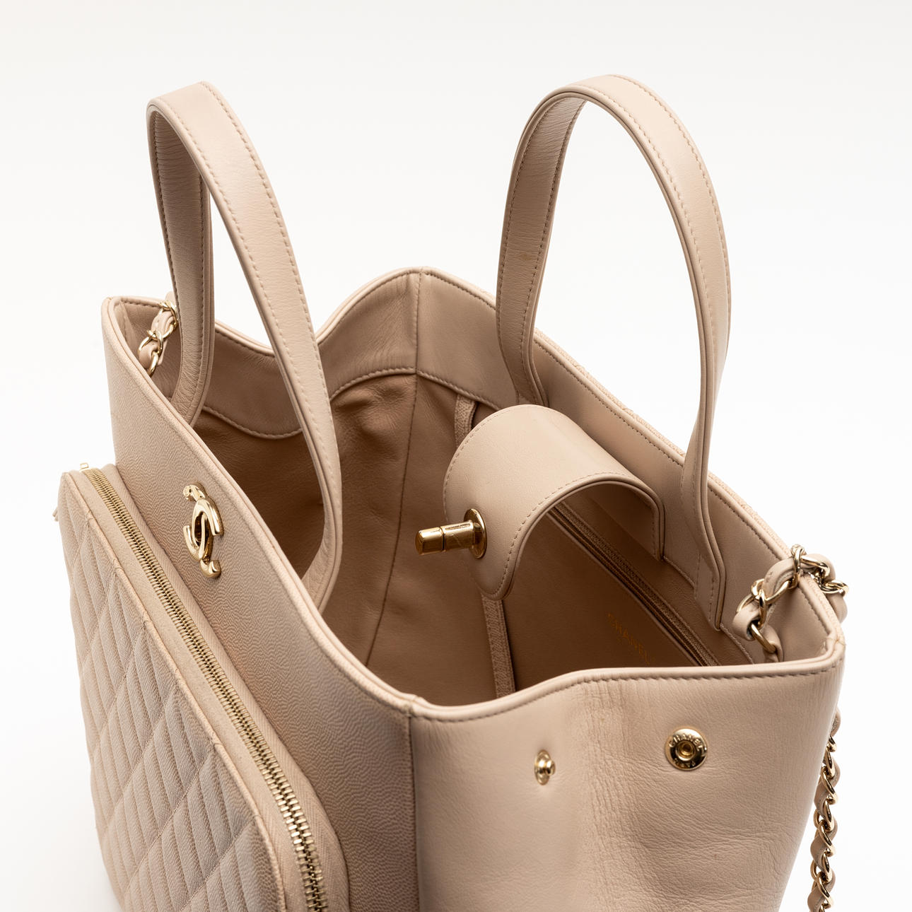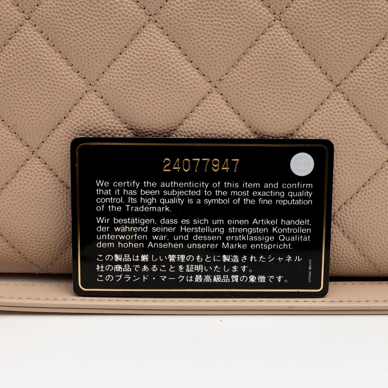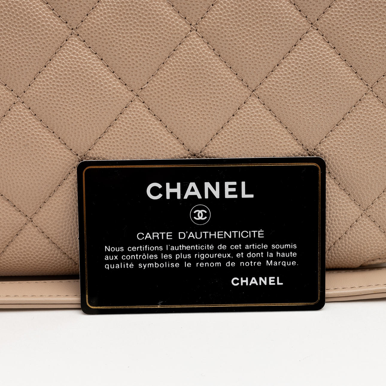 Hellrosafarbener Kaviar mit goldfarbener Hardware mit dem ikonischen CC-Verschluss. Gesteppte Rückseite und Vorderfach mit Reißverschluss, Schultergurt mit Kette. Der Innenraum bestand aus einem großen Fach mit drei kleineren Fächern (eines davon mit Reißverschluss), die mit passenden Fellen ausgekleidet waren. Stempel mit der Aufschrift „CHANEL MADE IN ITALY“ und mit Datumscode für 2017-2018. Carte D'Authenticité enthalten.