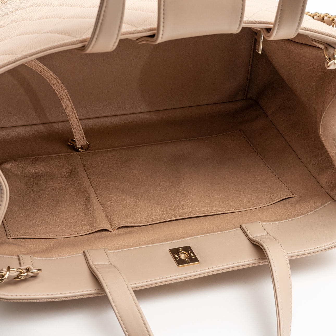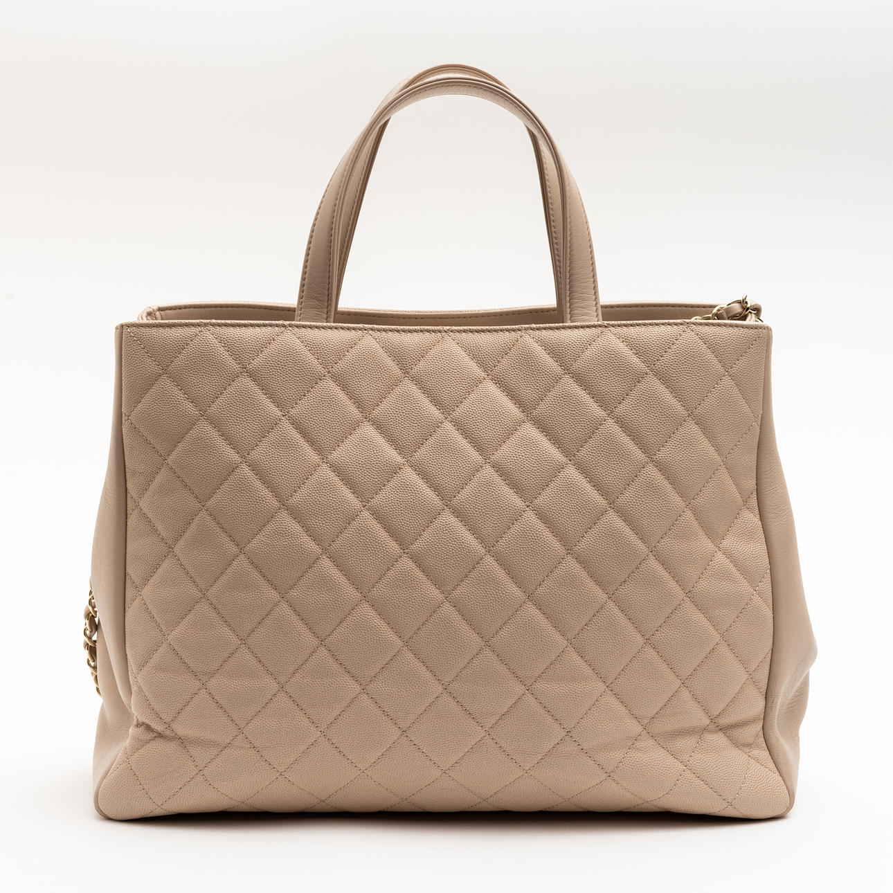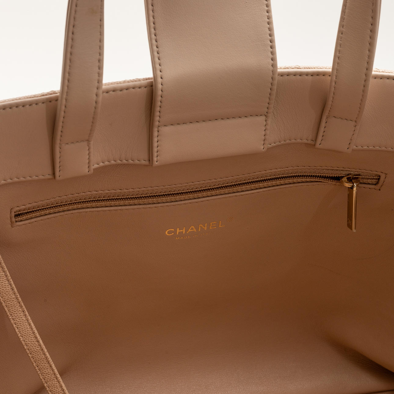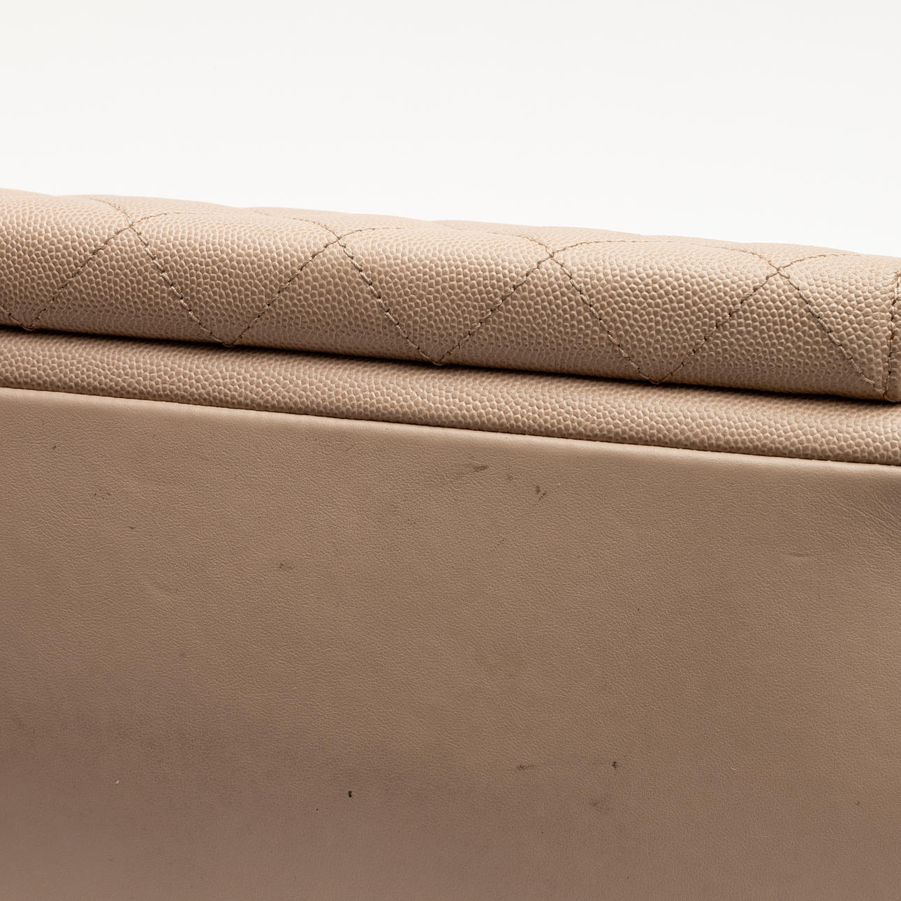 Hellrosafarbener Kaviar mit goldfarbener Hardware mit dem ikonischen CC-Verschluss. Gesteppte Rückseite und Vorderfach mit Reißverschluss, Schultergurt mit Kette. Der Innenraum bestand aus einem großen Fach mit drei kleineren Fächern (eines davon mit Reißverschluss), die mit passenden Fellen ausgekleidet waren. Stempel mit der Aufschrift „CHANEL MADE IN ITALY“ und mit Datumscode für 2017-2018. Carte D'Authenticité enthalten.