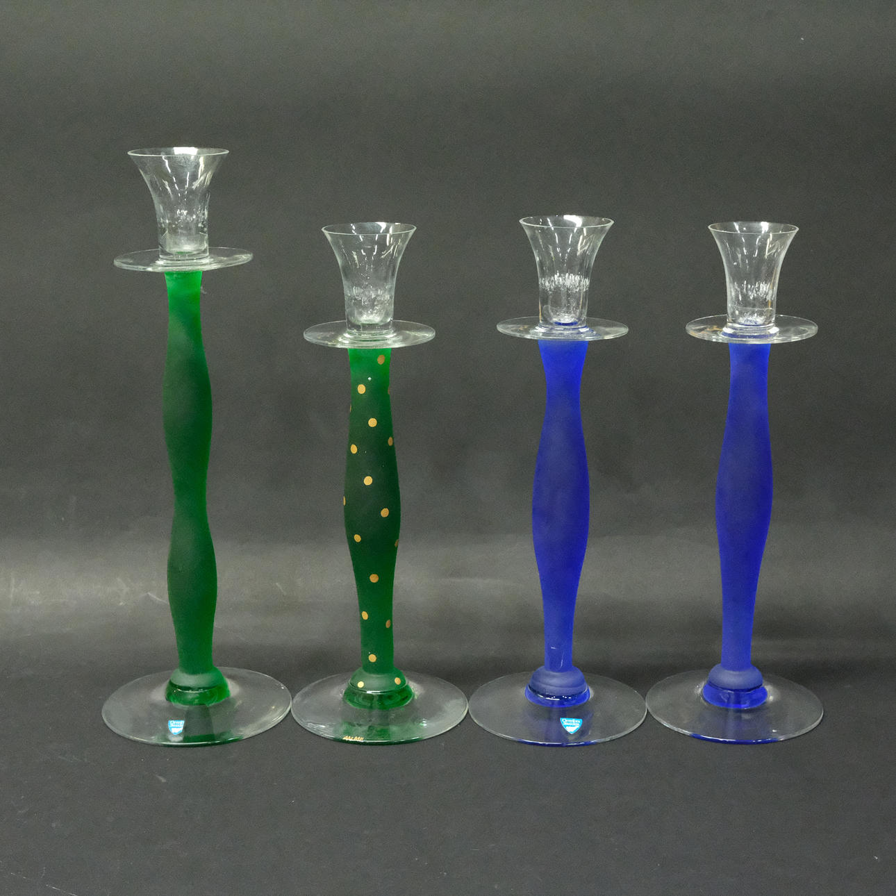 Ein Paar Kerzenständer in Blau, Höhe 29 cm, einer in Grün, Höhe 33 cm, sortiert II, einer in Grün mit Punkten in Gold, Höhe 29 cm, ich sortiere.