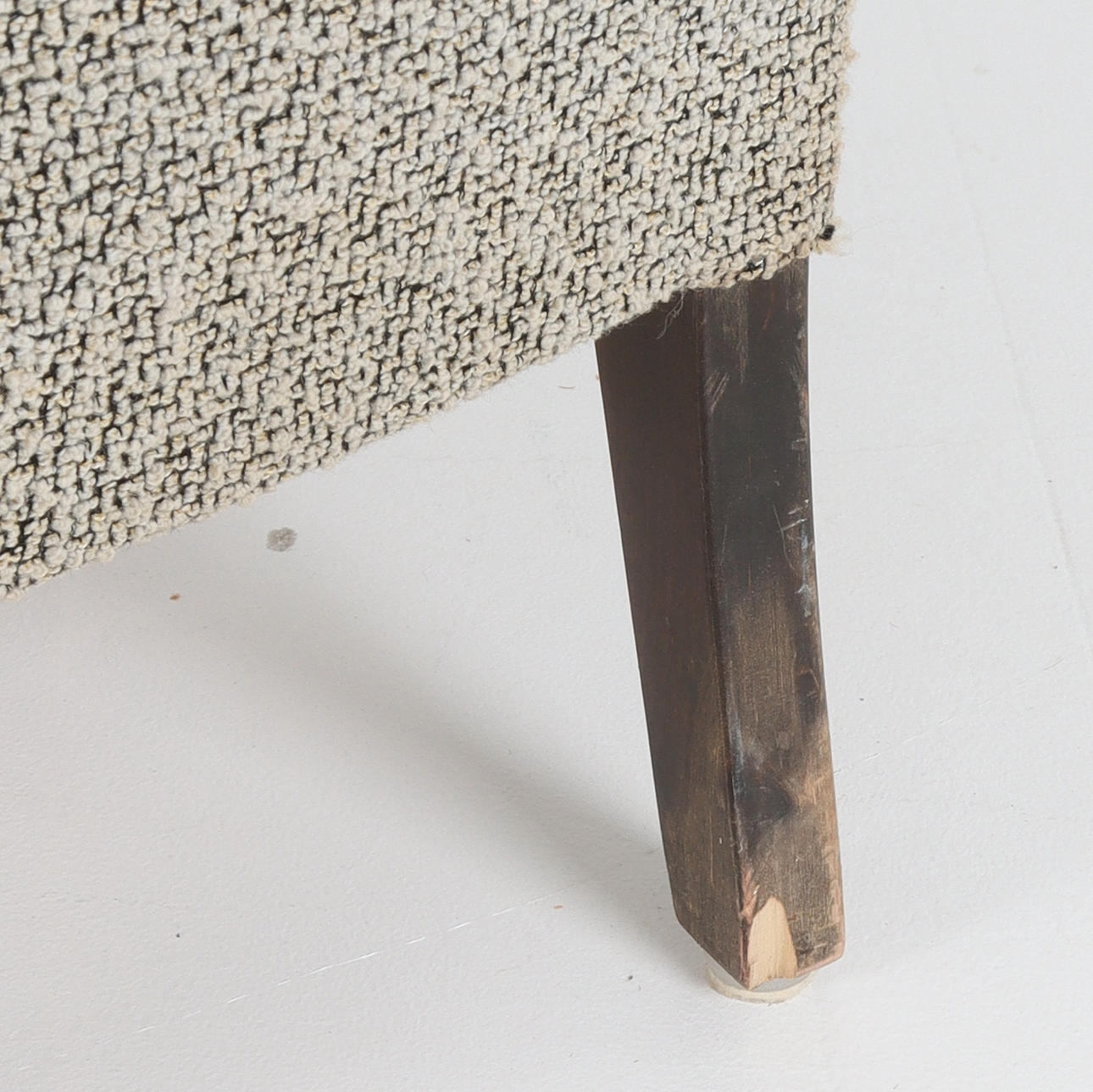 Verschleiß und Abnutzung. Lose Armlehne auf der rechten Seite. Abnutzung der Armlehnen. Ablehnung eines Hinterbeins.