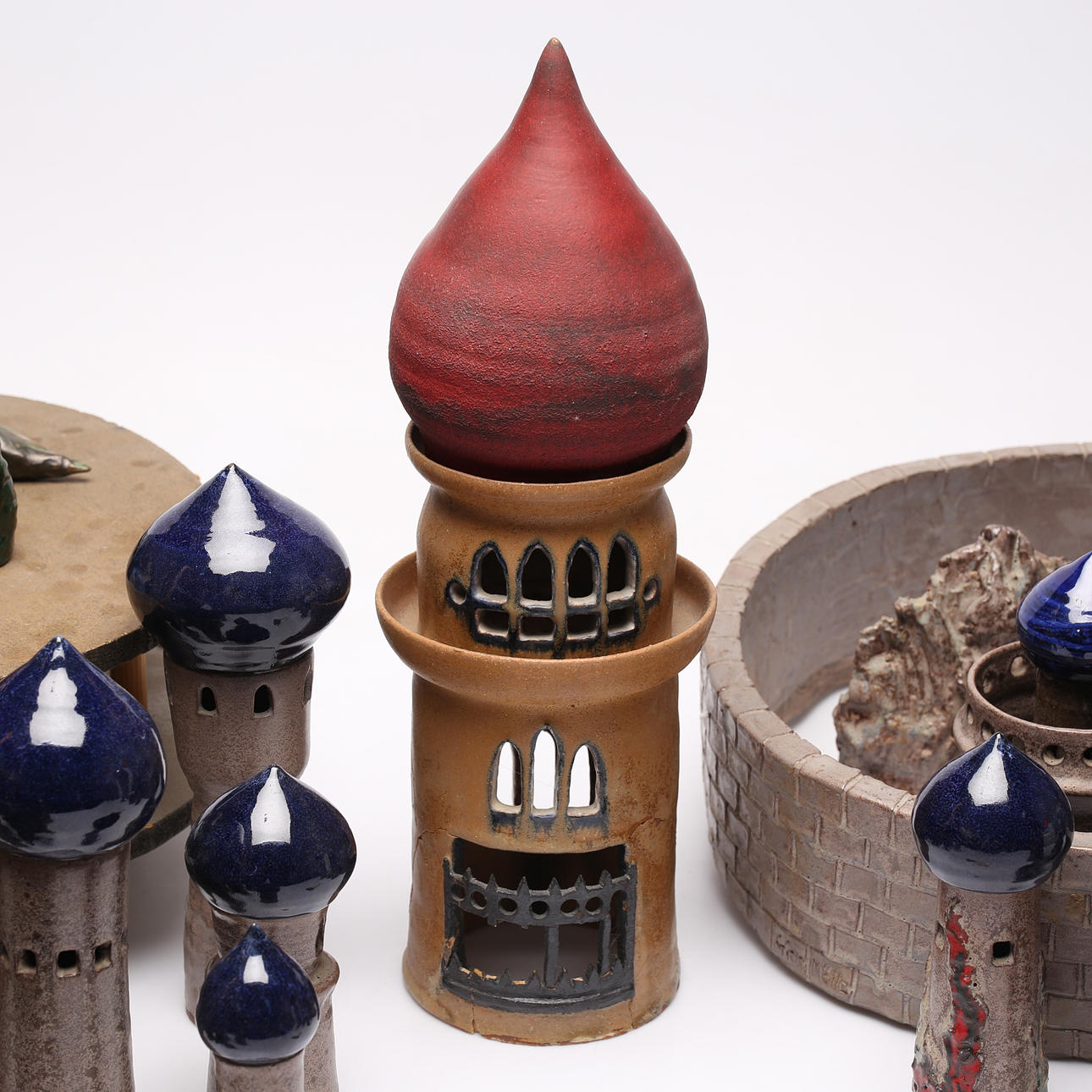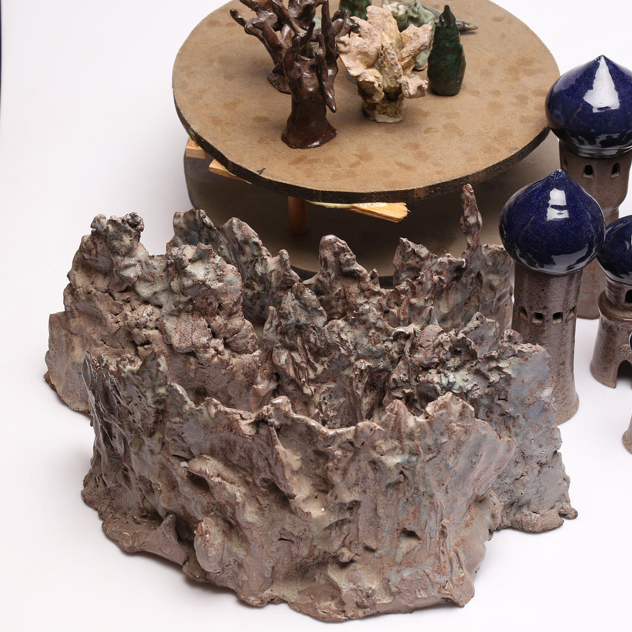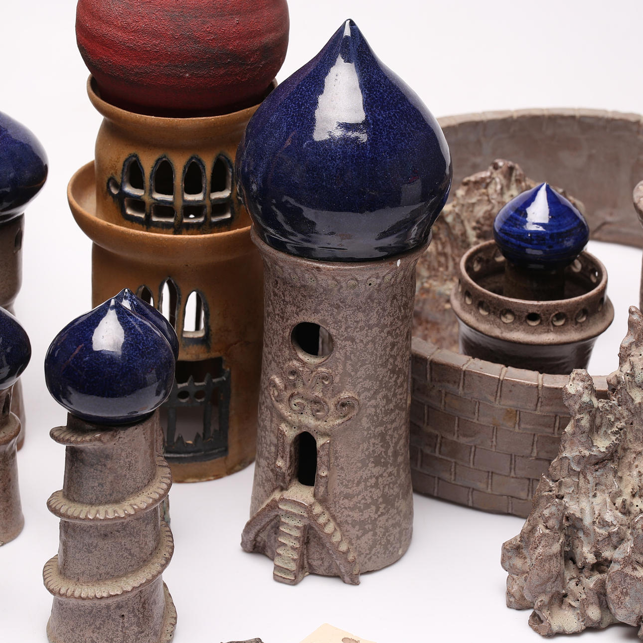 Großes Grundstück mit Teilen/Skulpturen. Höhe des höchsten Turms ca. 40 cm.