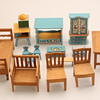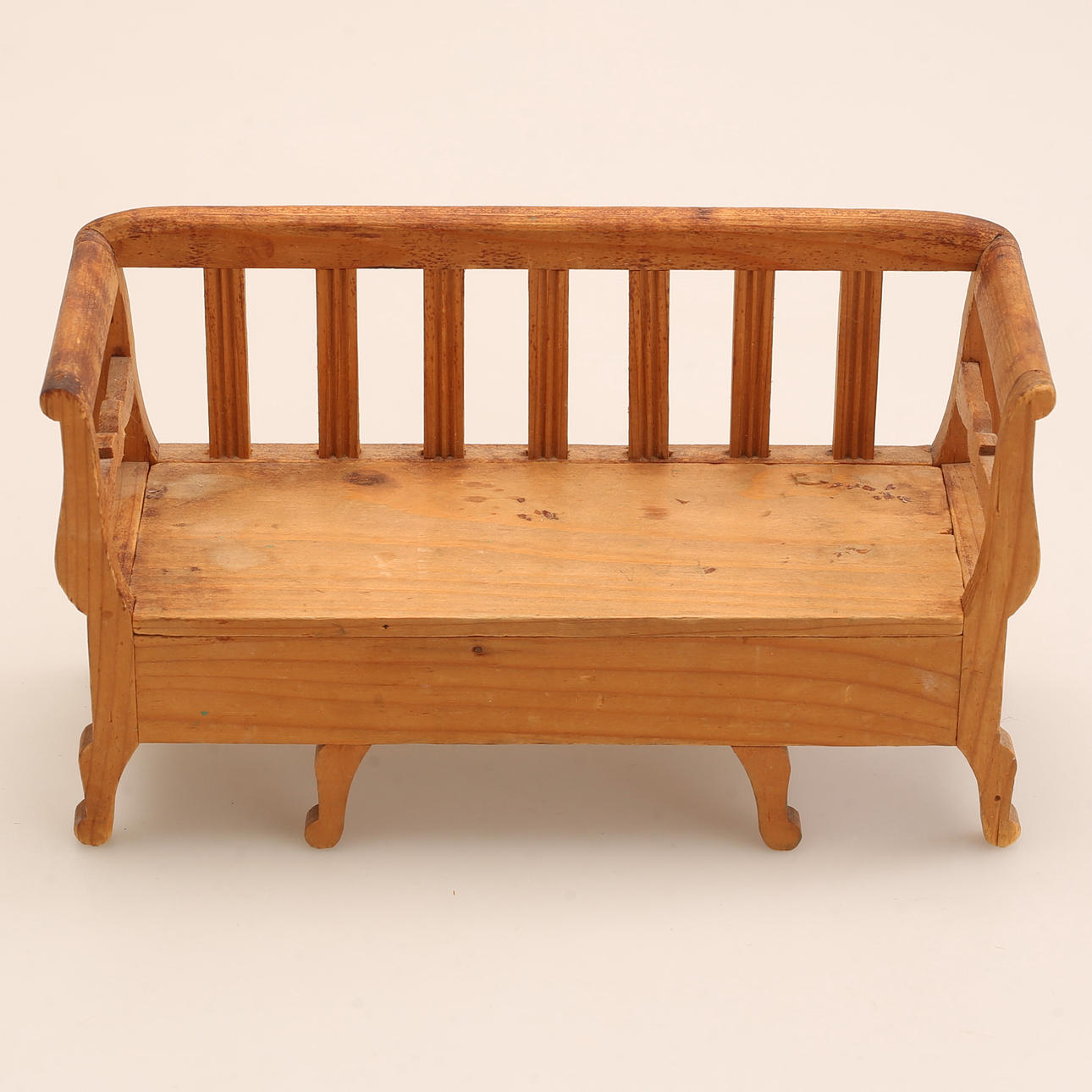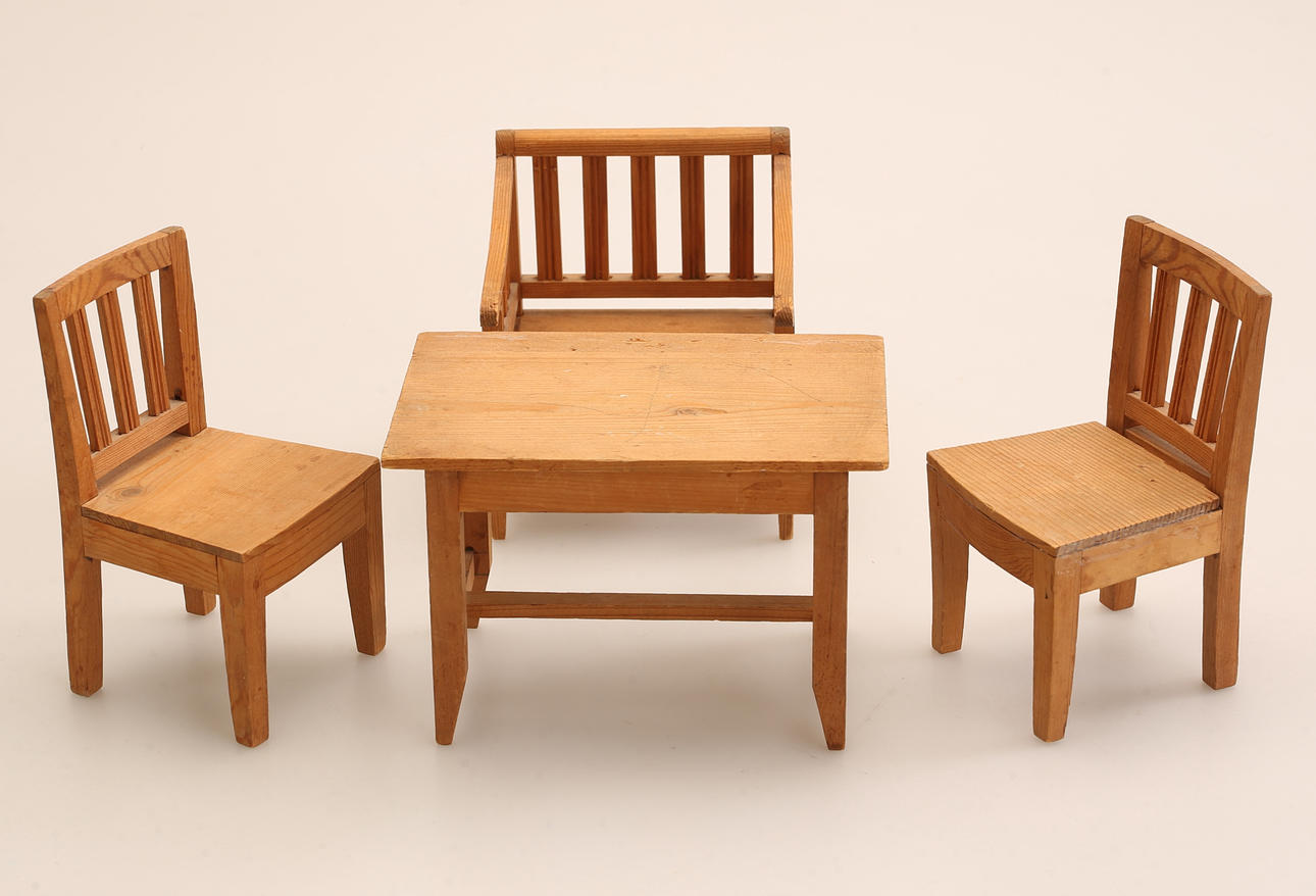 SOFA, Tisch und zwei Stühle, Kiefernholz, Höhe des Sofas ca. 13,5 cm, Länge ca. 24 cm. Möbel, bemalt, Schrankhöhe ca. 12 cm.