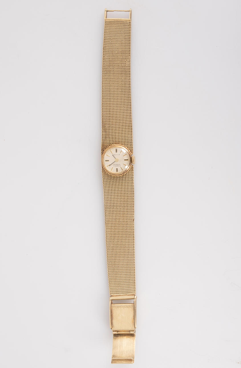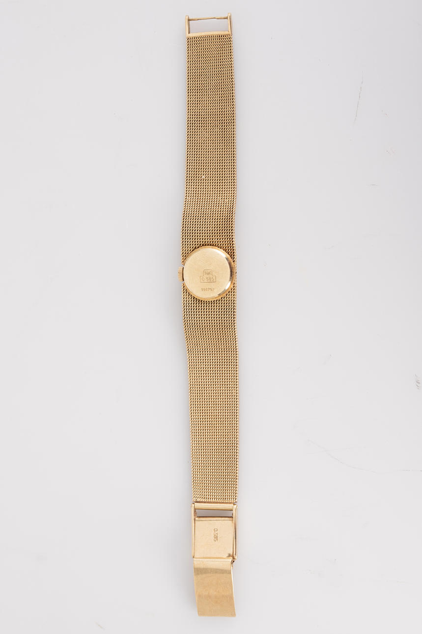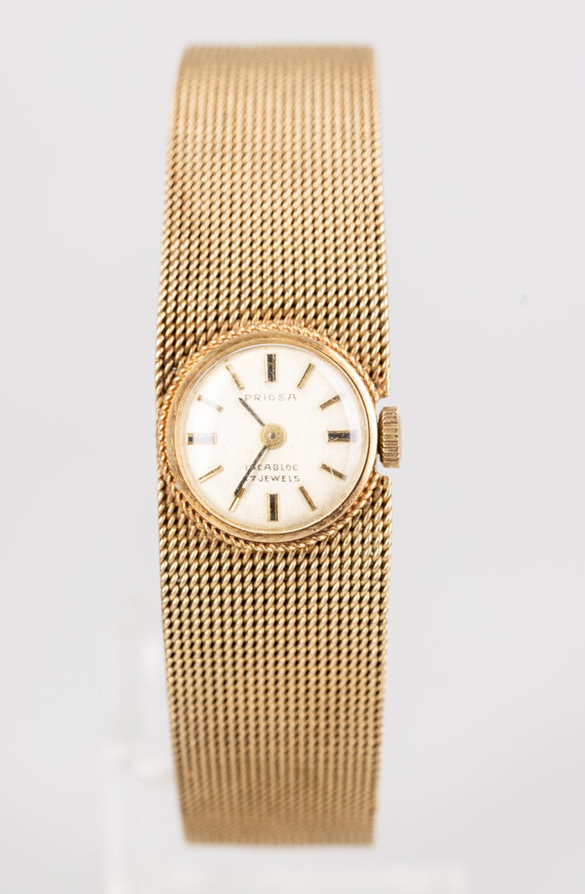 Armbanduhr von Priosa, Handaufzug, gefertigt aus 585er Gold, Armband mit Faltschließe, Zifferblatt mit Stunden und Minuten Zeiger. Maße ca. Gehäusedurchmesser Ø 16 mm, Länge 17 cm. Gewicht ca. 38,5 Gramm. Zum Zeitpunkt der Begutachtung lief die Uhr, Stockholms Auktionsverk garantiert nicht für die Funktionalität.