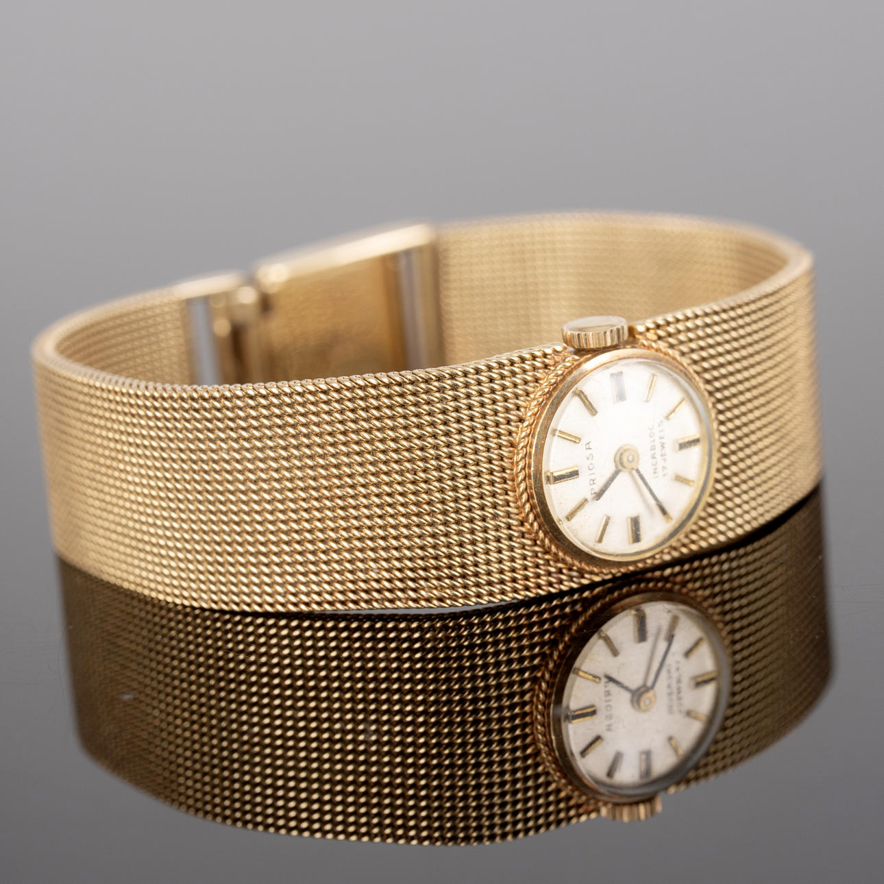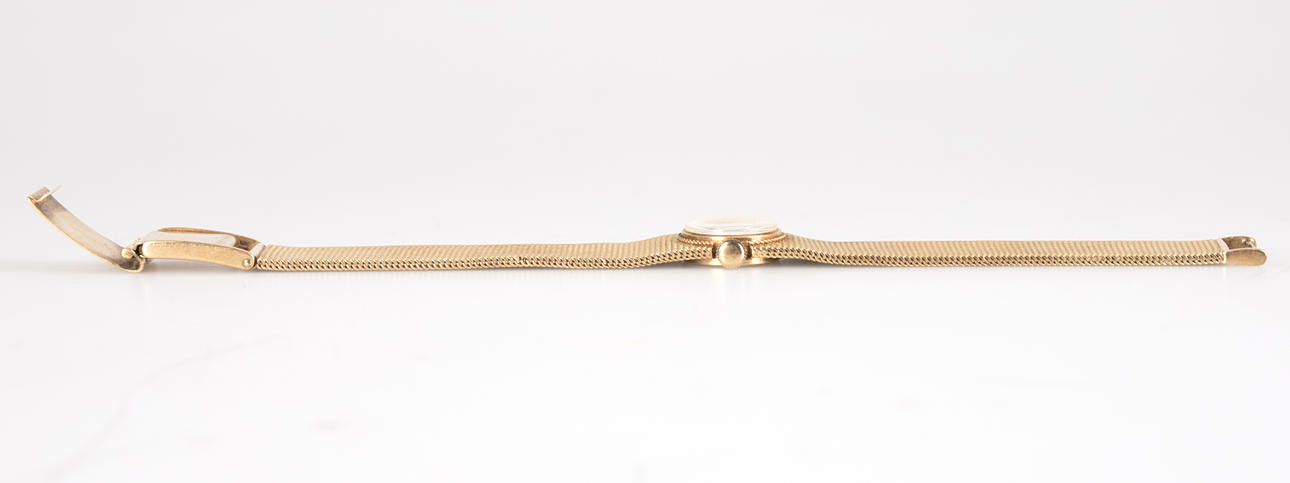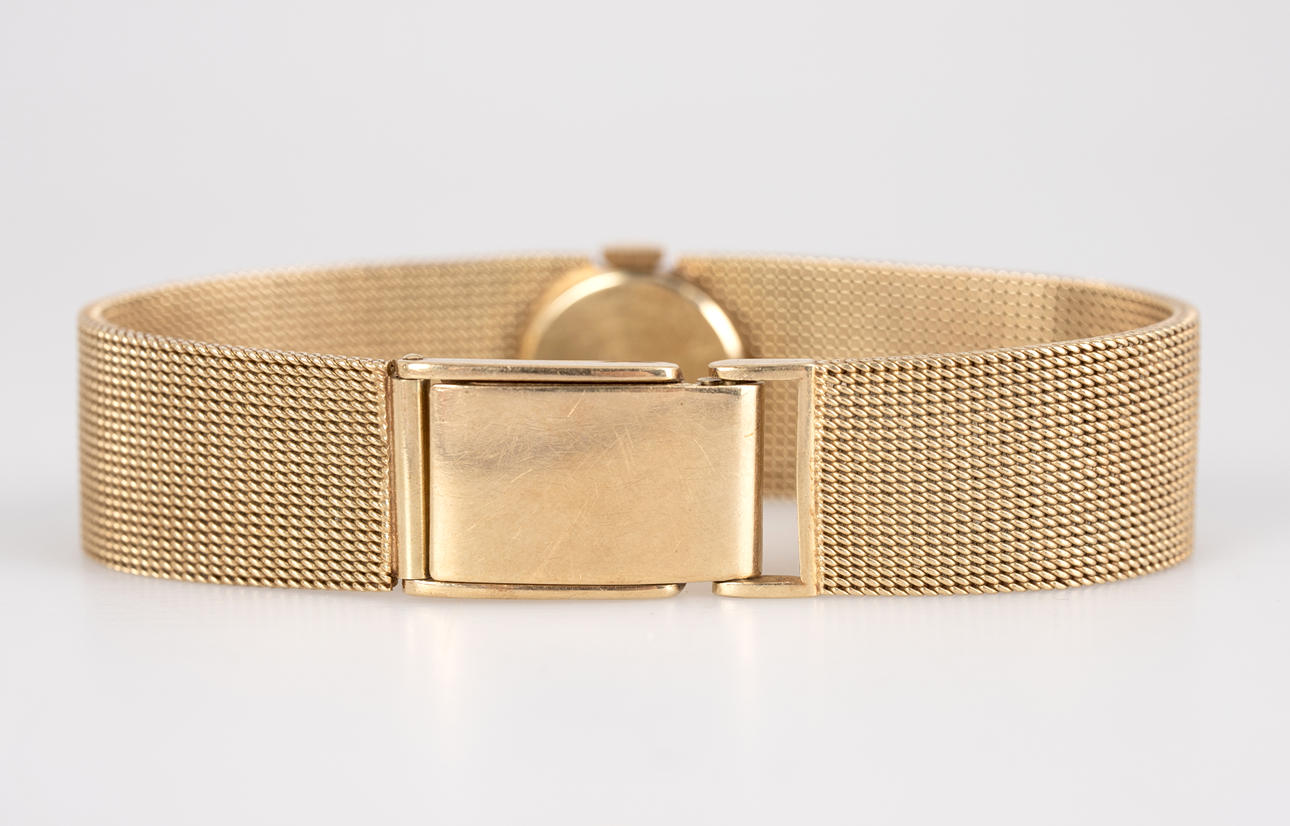 Armbanduhr von Priosa, Handaufzug, gefertigt aus 585er Gold, Armband mit Faltschließe, Zifferblatt mit Stunden und Minuten Zeiger. Maße ca. Gehäusedurchmesser Ø 16 mm, Länge 17 cm. Gewicht ca. 38,5 Gramm. Zum Zeitpunkt der Begutachtung lief die Uhr, Stockholms Auktionsverk garantiert nicht für die Funktionalität.