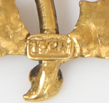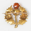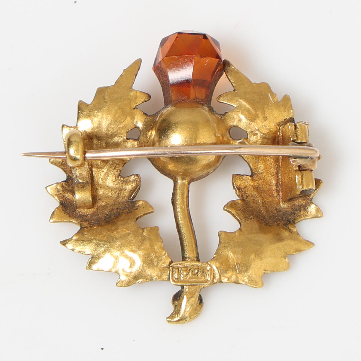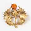 Die Brosche ist einer Distel nachempfunden, mit Cairngorm-Blütenkopf, 24,5 mm breit, 27 mm hoch, 3,7 g.