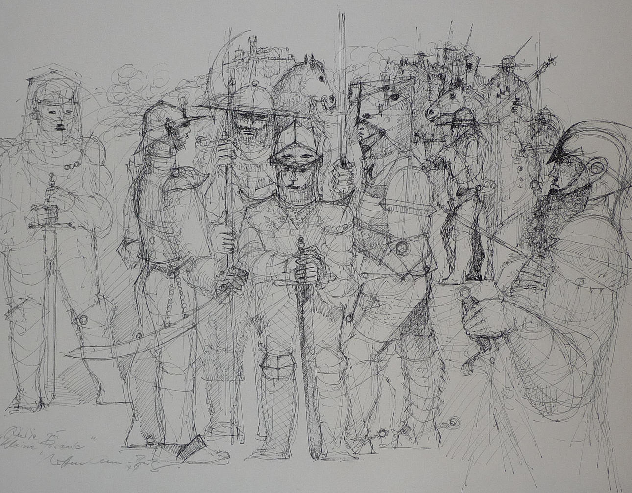 (Meerbeck 1915-1997 Bamberg) Nixenversammlung, Mischtechnik, 1978 (Randmängel); „Studie zu kleine Parade“, 1976, Tuschfederzeichnung; Akte im Glas, Lithographie; „Der Maler“, Offsetdruck, 1975. Alle handsigniert. 15,5 x 21,3 cm bis 70 x 10 cm (Blatt). - Gründer der Hoffmannsklause in Bamberg, Bug.