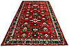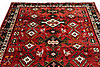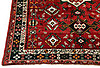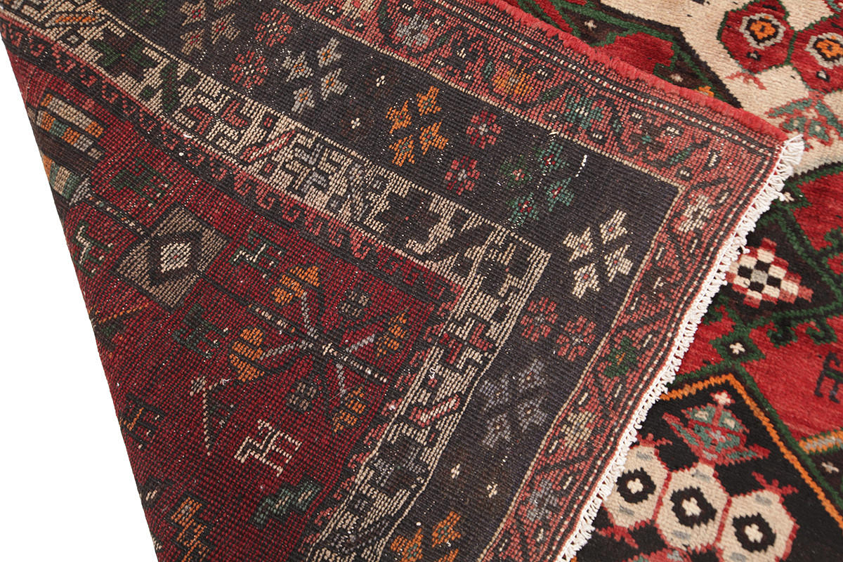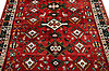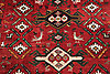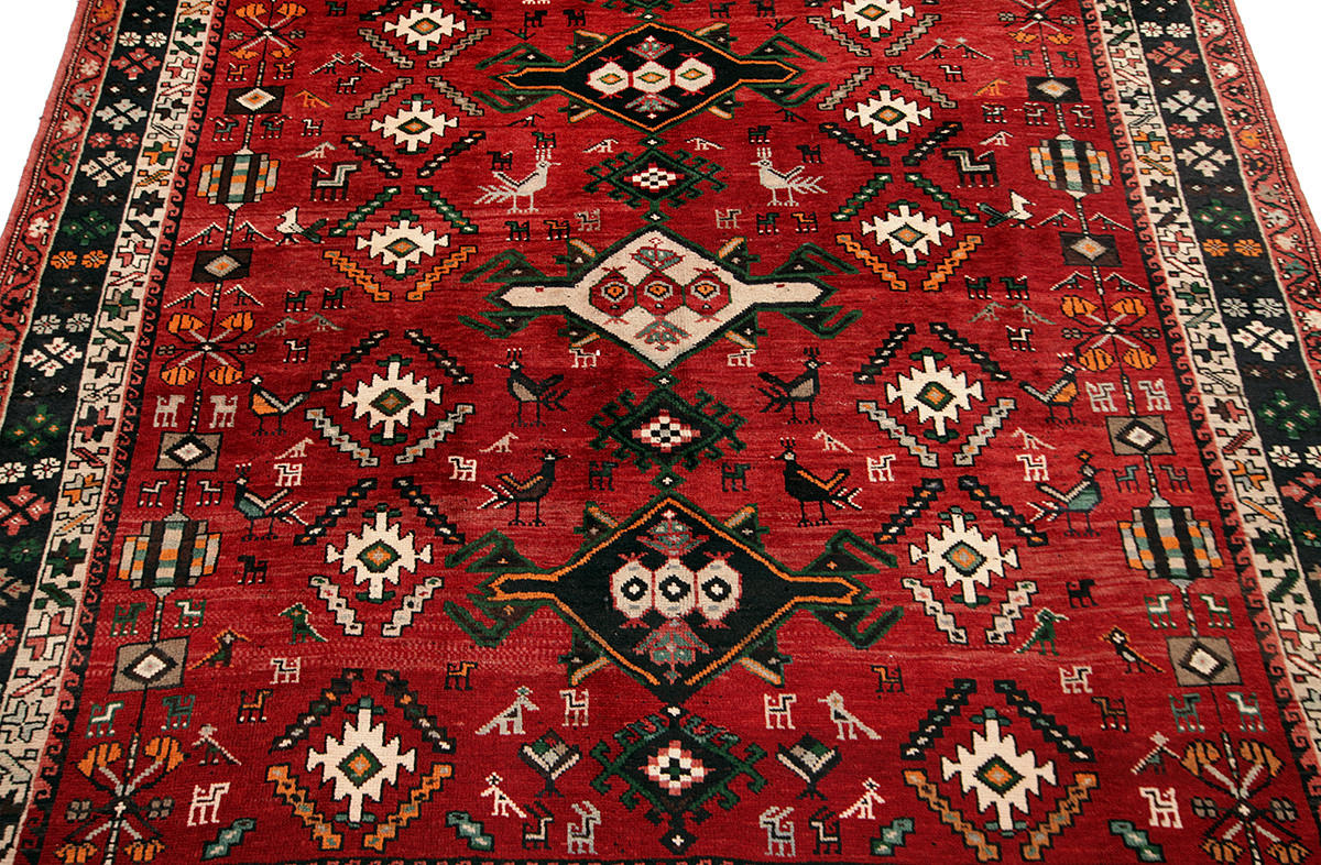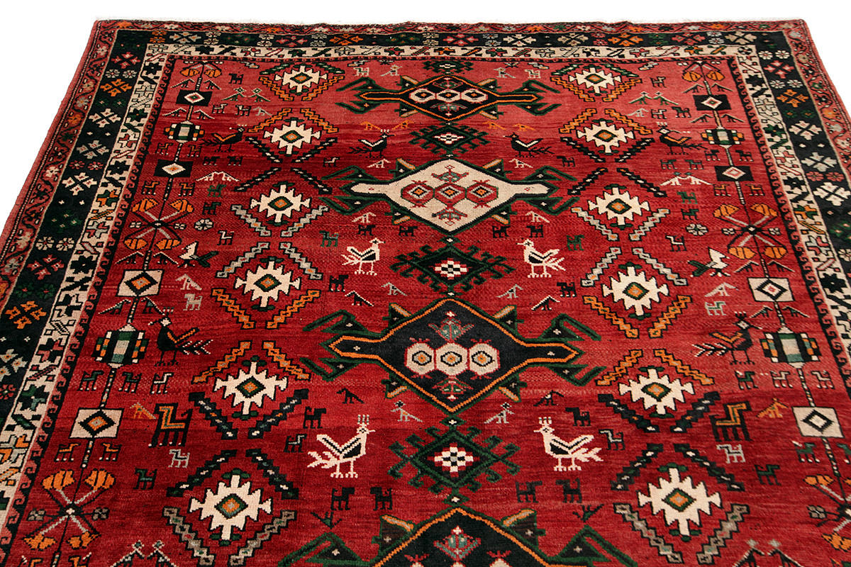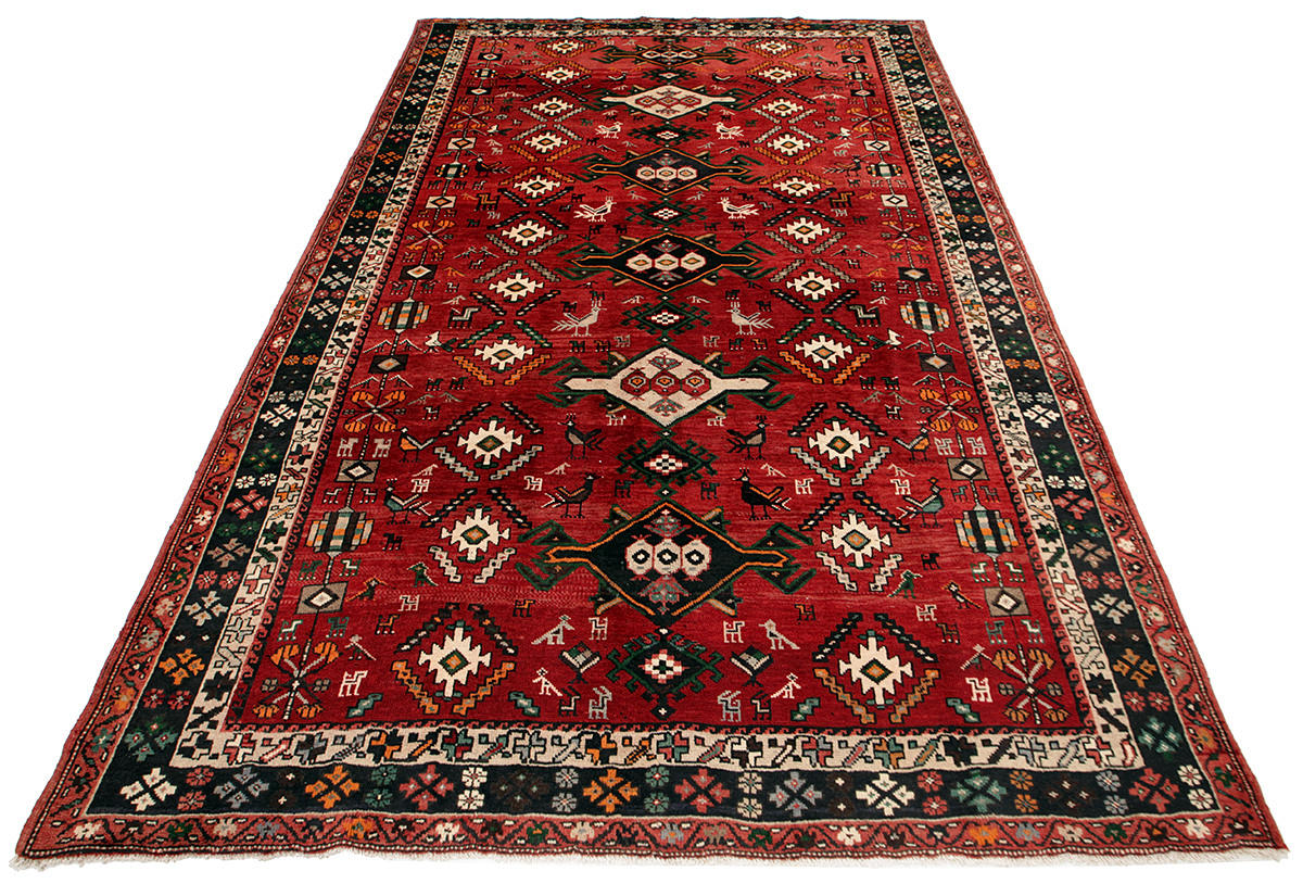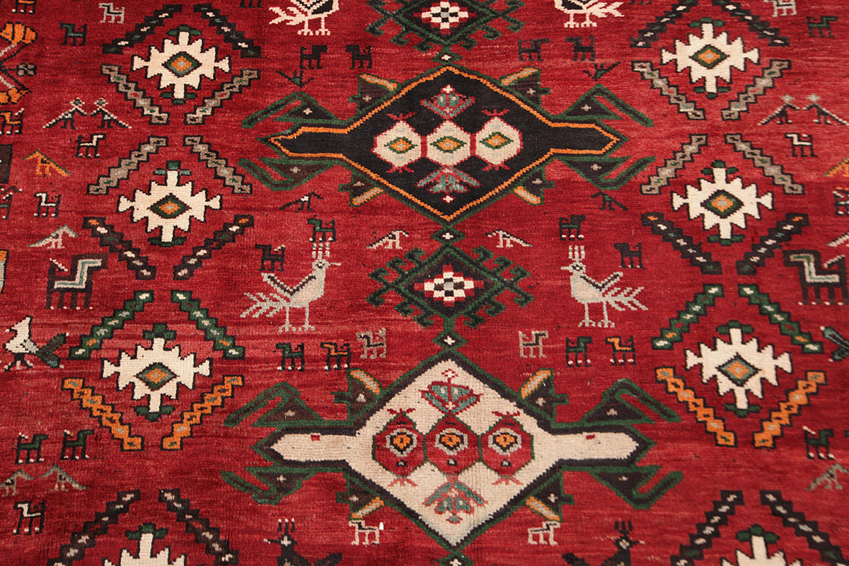 Geometrische Medaillons und Tiermotive auf rostrotem Grund.