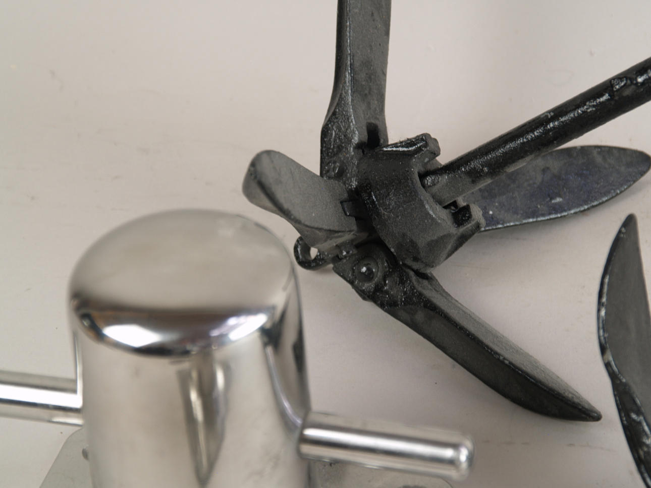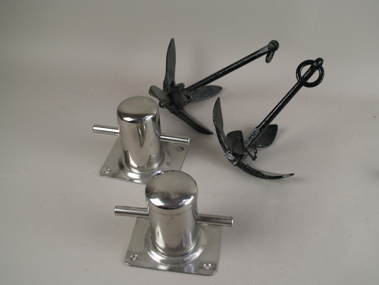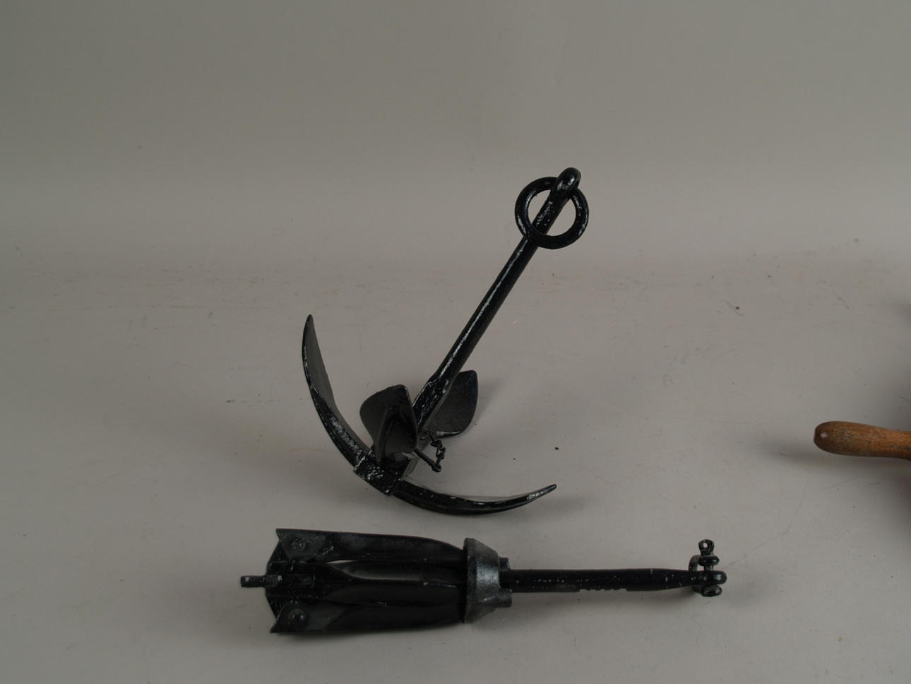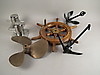 Konvolut Schiff-Fahrt, unter anderem Schiffsschraube (Durchmesser ca. 33 cm), Steuerrad (Durchmesser 46 cm), 2x Anker (ca. 28 cm).