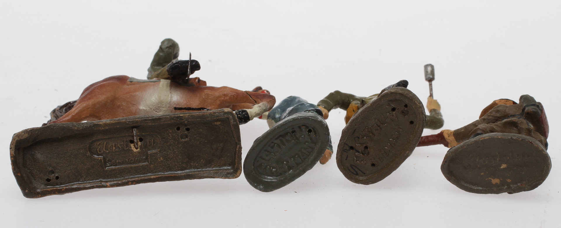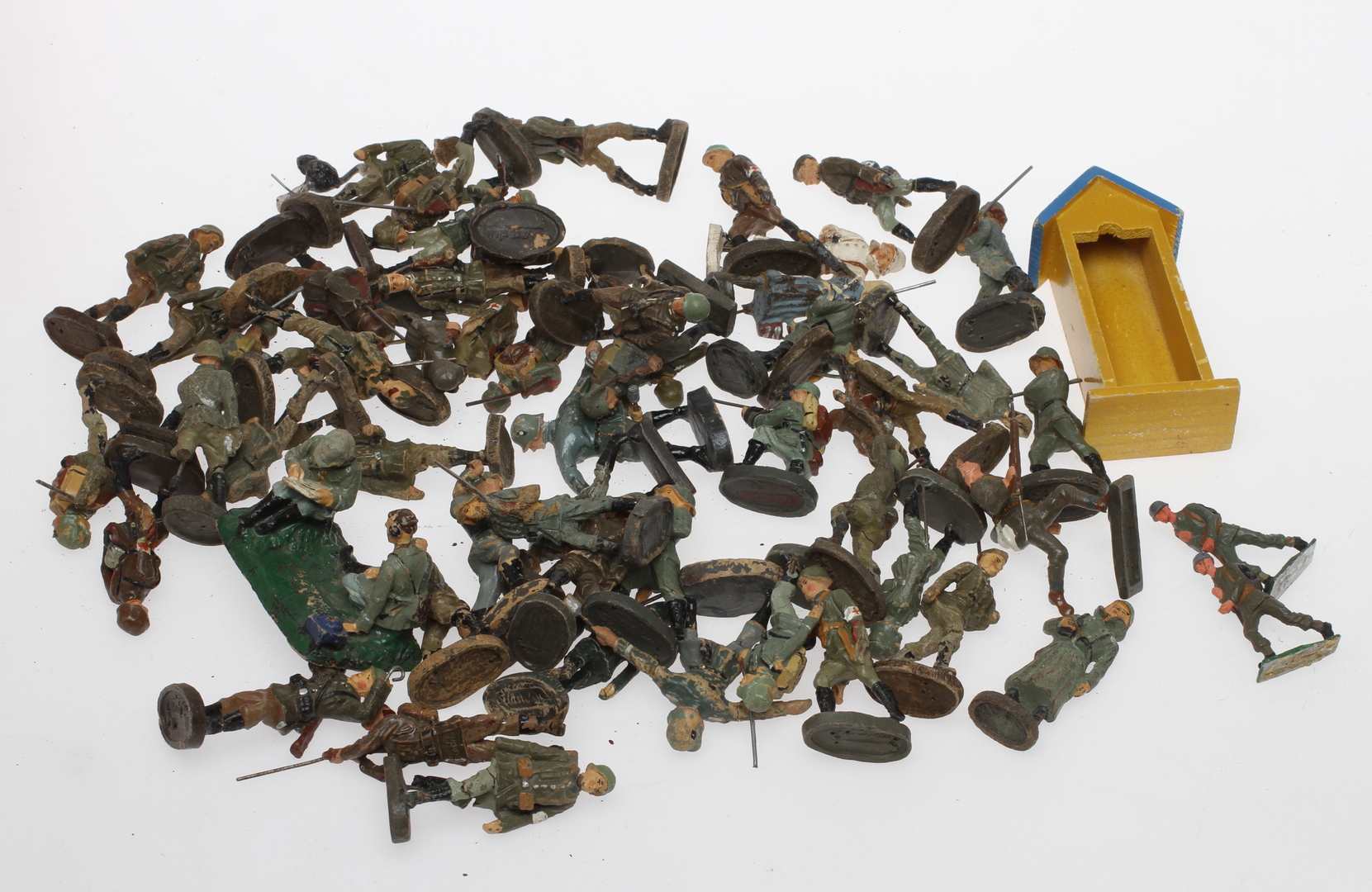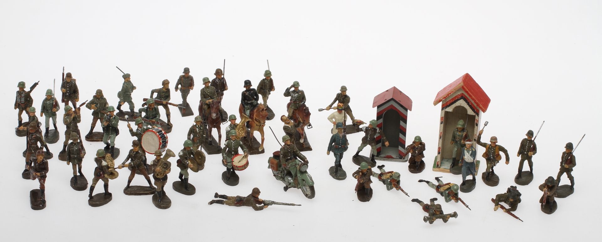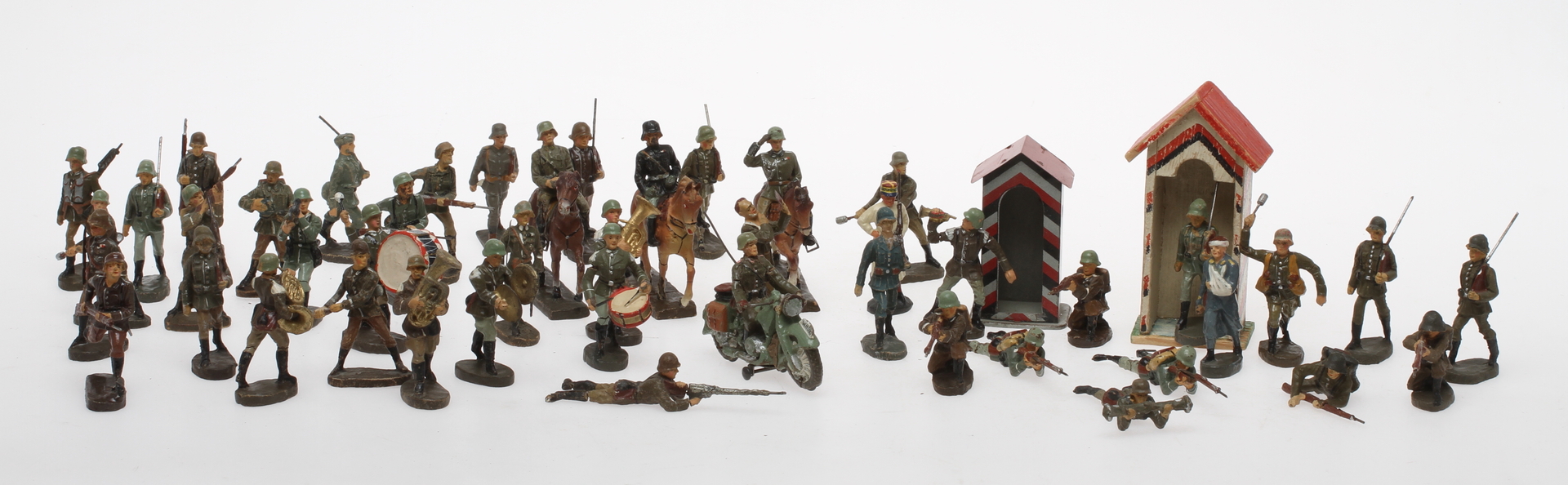 45657. ELASTOLIN 40 Figuren davon 3 zu Pferd, Wachkur.