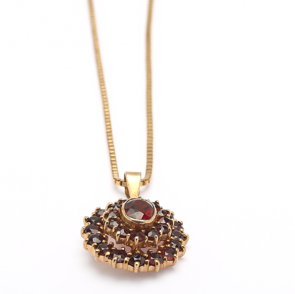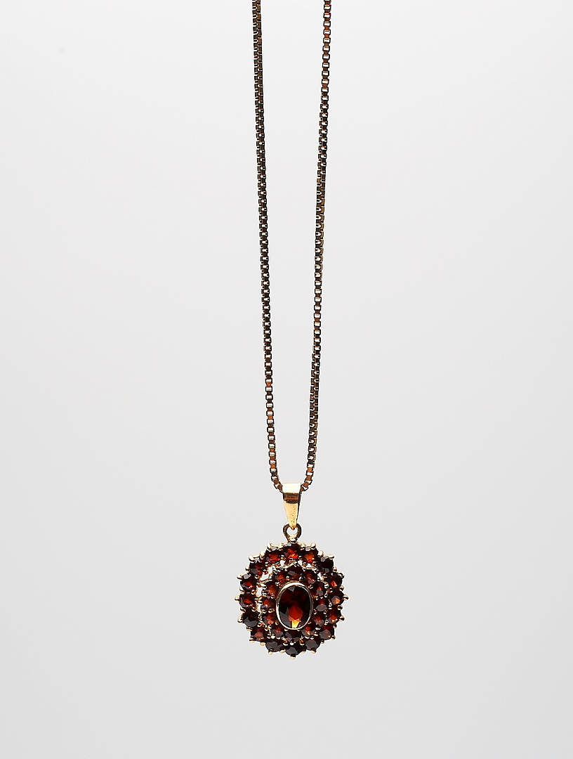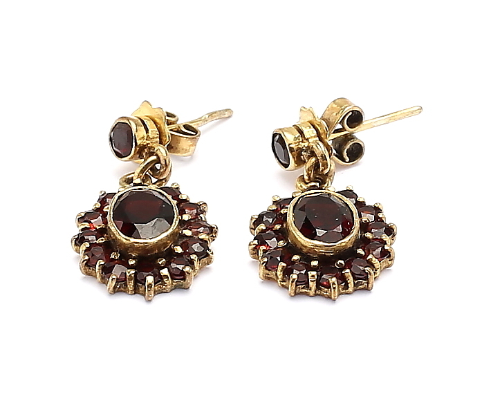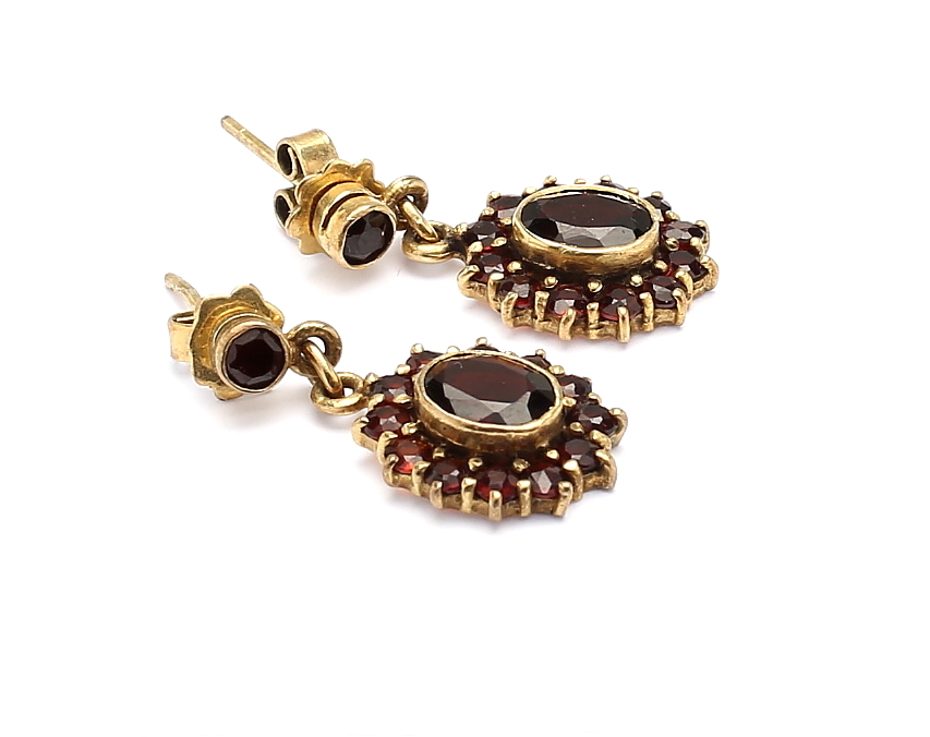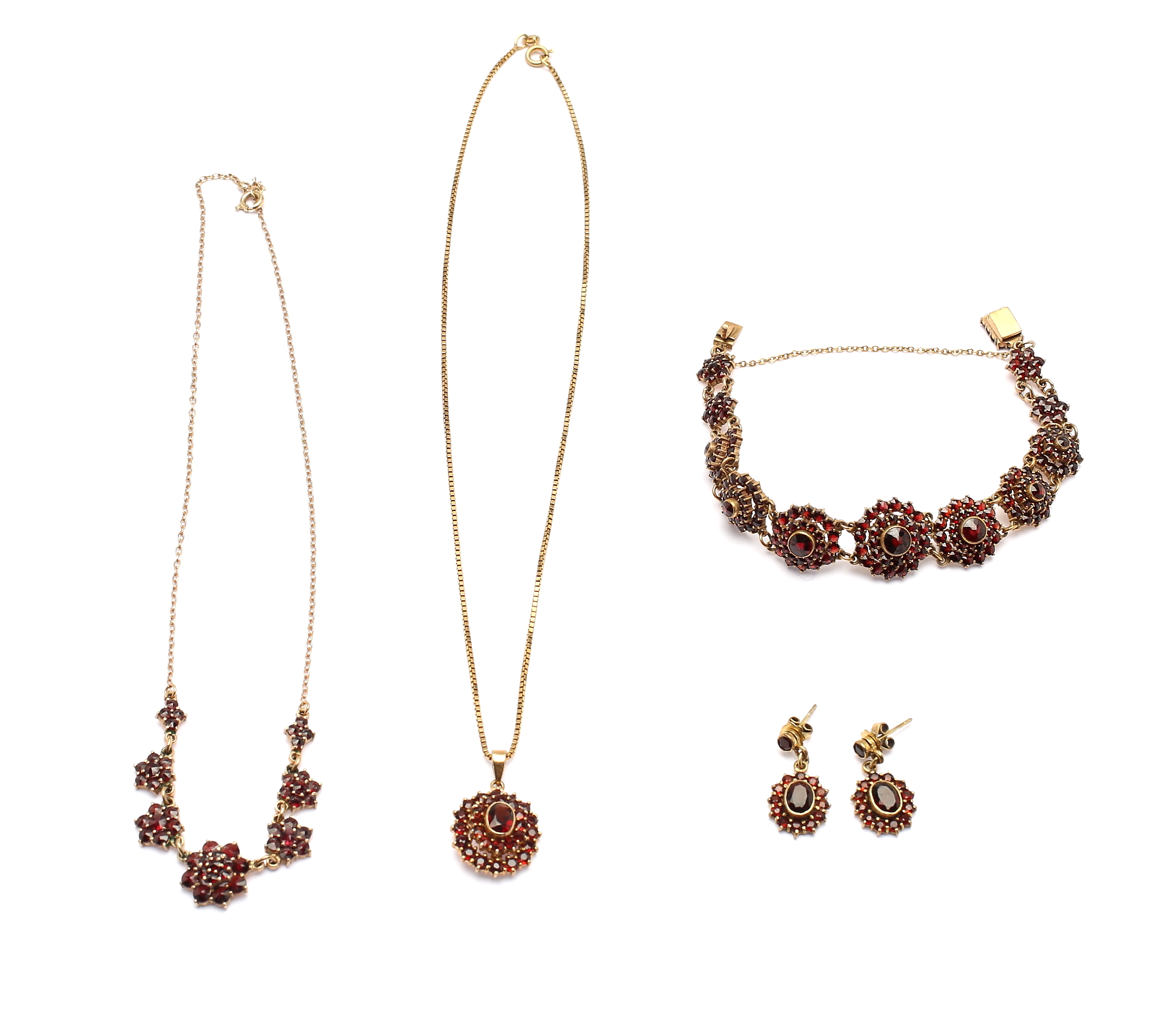 457382. SET, 4 Teile, gelbes Metall und Granate.