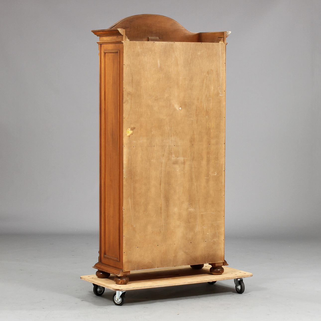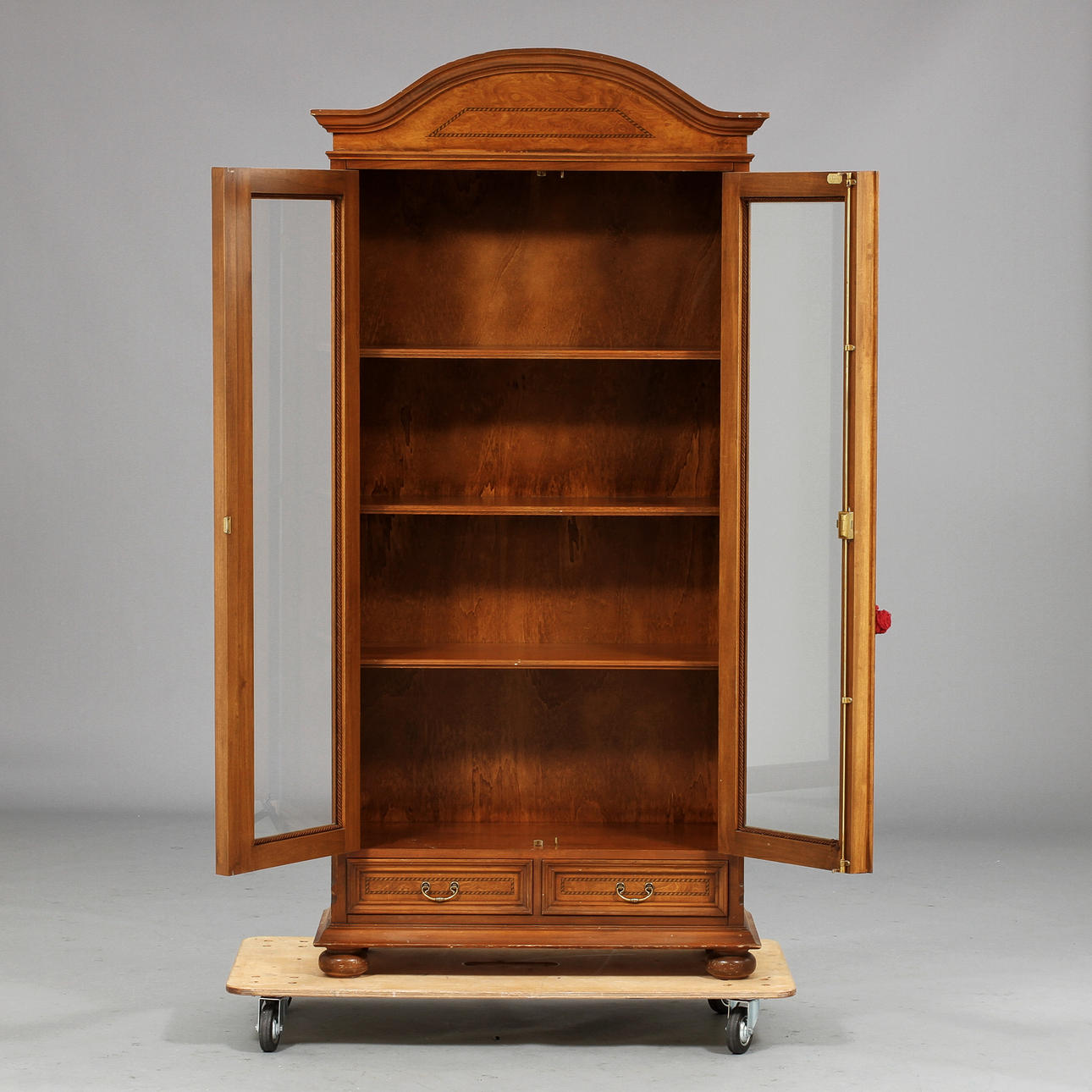 Nussbaum. 2 Schubladen und 3 Einlegeböden hinter Glastüren Länge 95 cm, Breite 42 cm, Höhe 198 cm.