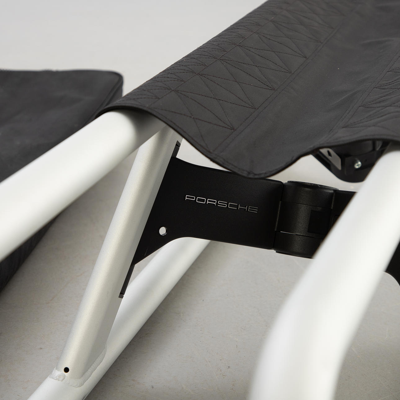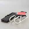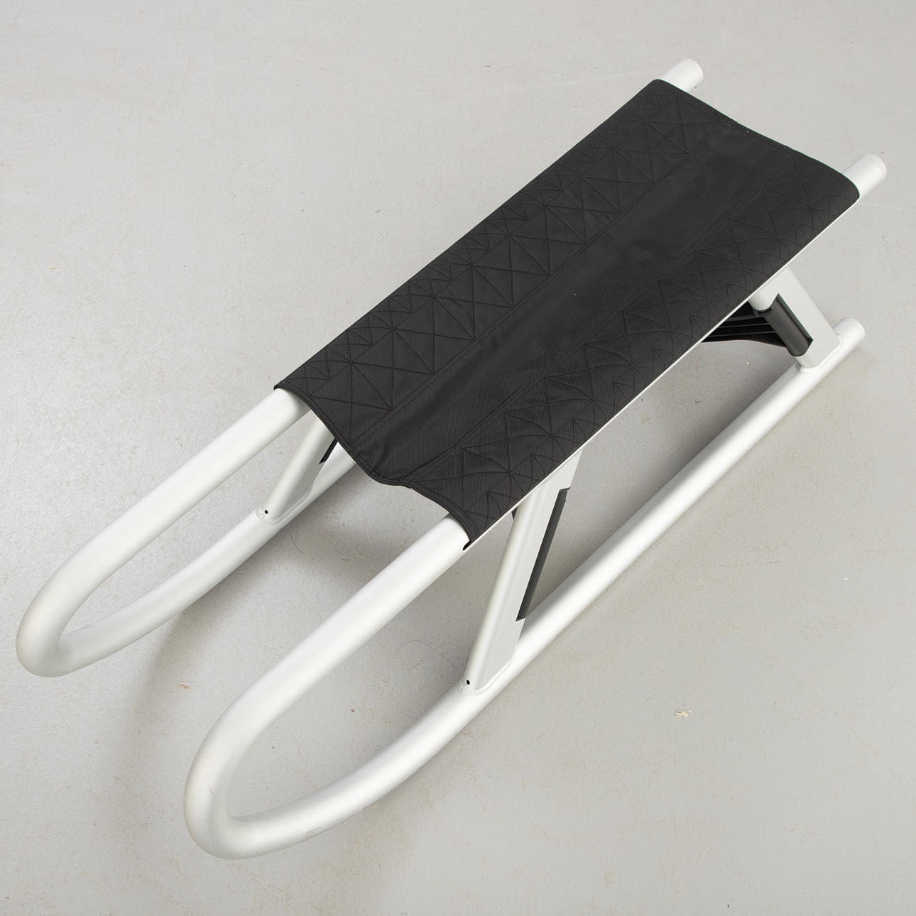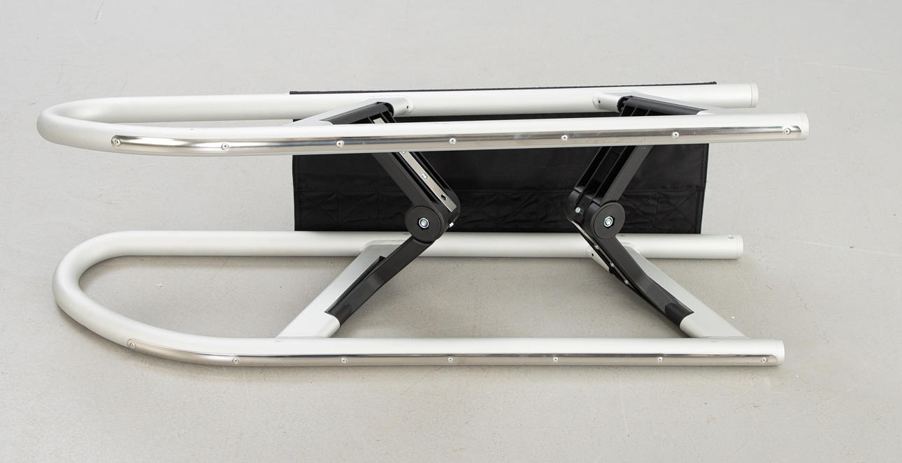 Aluminium Rahmen mit Edelstahlkufen. Sitztuch aus Nylon in schwarz und rot. Mit Tragetasche.