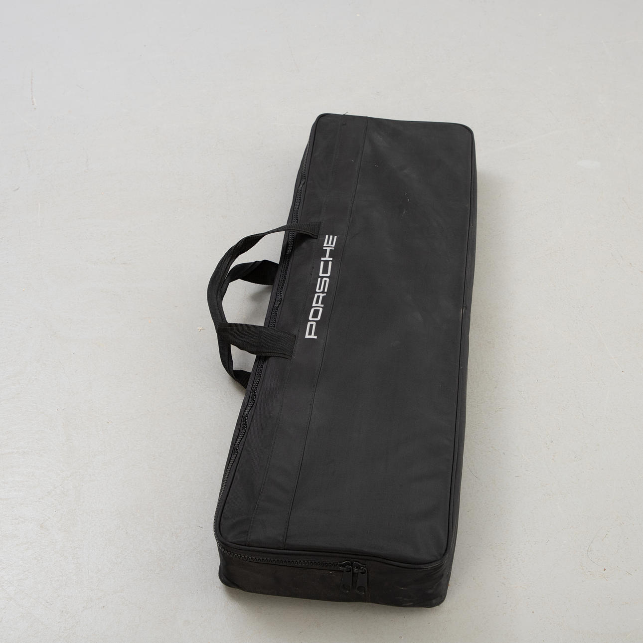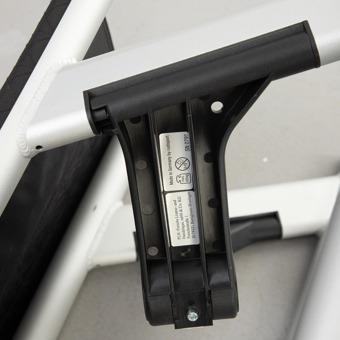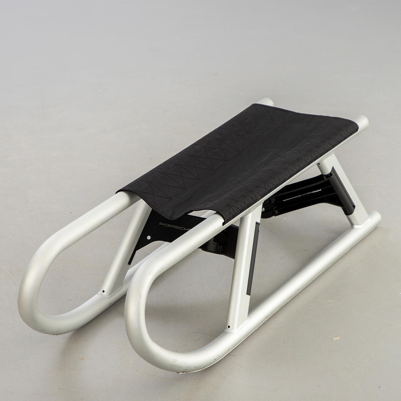 Aluminium Rahmen mit Edelstahlkufen. Sitztuch aus Nylon in schwarz und rot. Mit Tragetasche.