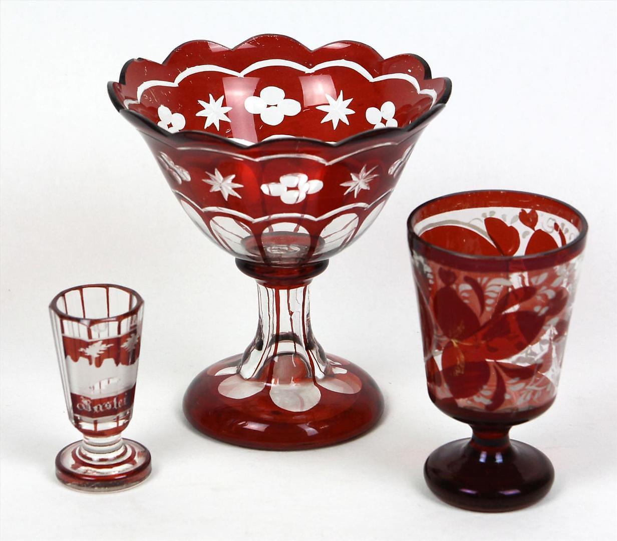 461278. 3 RUBINGLAS TEILE, um 1900.