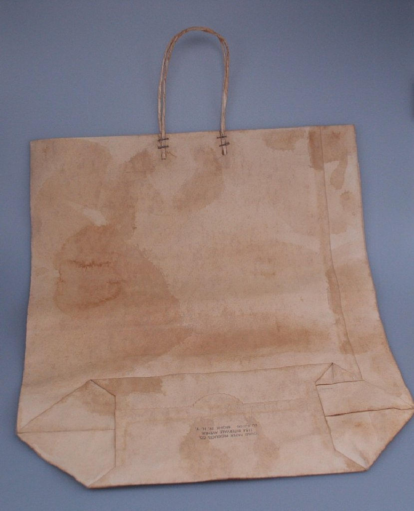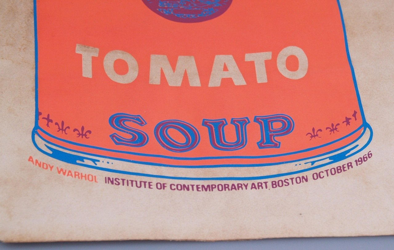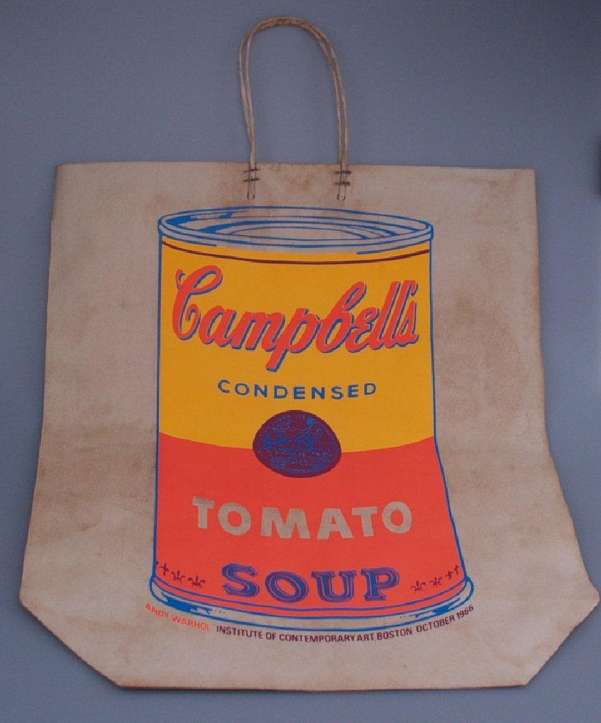 Shopping Paper Bag with Andy Warhol's Campbell's Tomato Soup Can motif- serigraph in neon colours on thick paper,marked along the lower edge of the can with "Andy Warhol, Institute of Contemporary Art, Boston, October 1966",stamped on the bottom with "Guild Paper Products CO 1154 Intervale Avenue LU 9-3900 Bronx 59, N. Y." light- and time-staining, some horizontal folds, several foxmarks,print.circa 41x24cm / bag without handles circa 49,5x42,5cm.