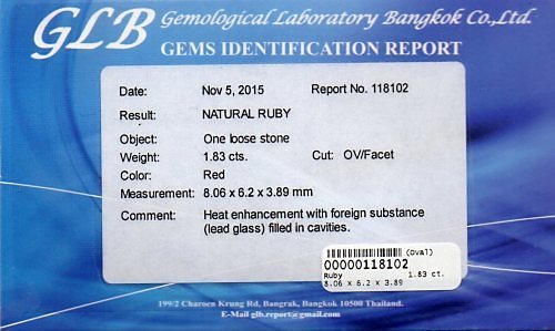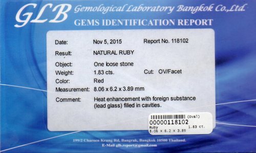 468618. RUBIN, 1.83 CT. Red, Certificete.