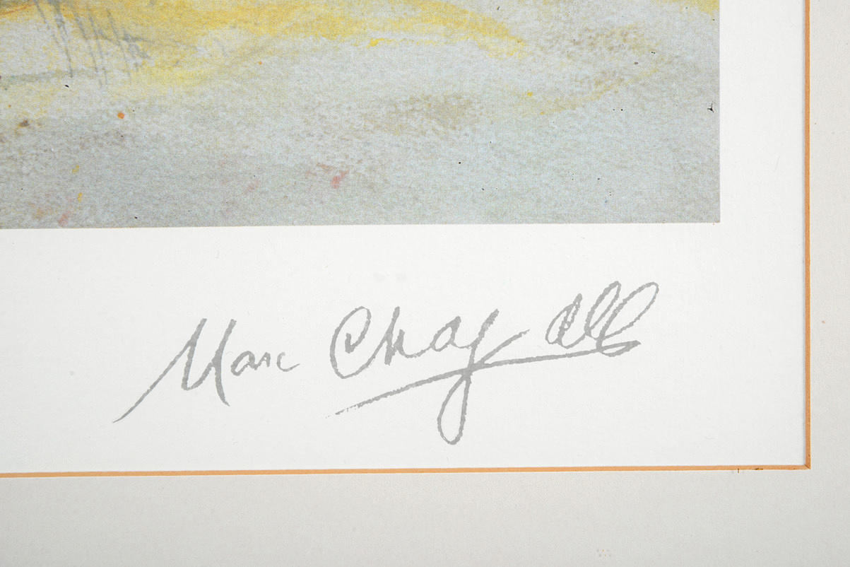 Marc Chagall (06.07.1887 Witebsk - 28.03.1985 Saint-Paul-de-Vence); Frablithographie (verso als Granolitho ausgewiesen) auf geschöpftem Papier, unten rechts im Druck signiert, in Graphit nummeriert I 92 / 500, im Passepartout gerahmt, gerundete Zierleiste mit Blumendekor. Maße ca. Rahmen 83 x 103 cm, Passepartout 54 x 74 cm.