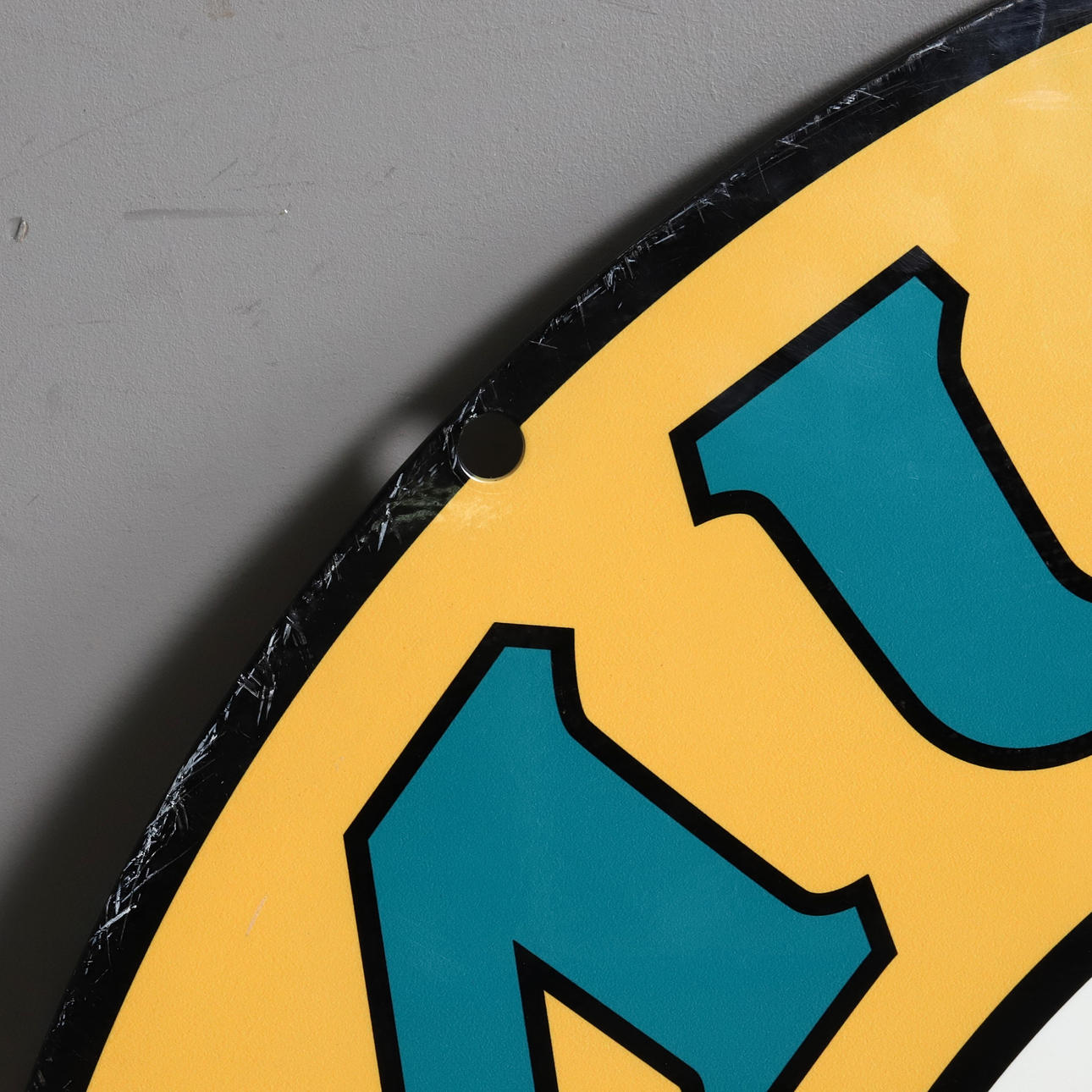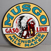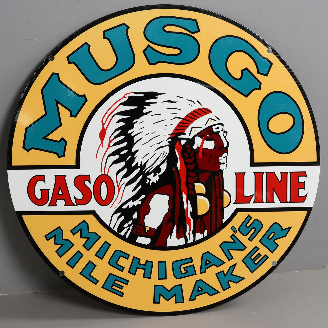 Emailplatte, doppelseitig, „MUSGO“ Benzin, Reproduktion.