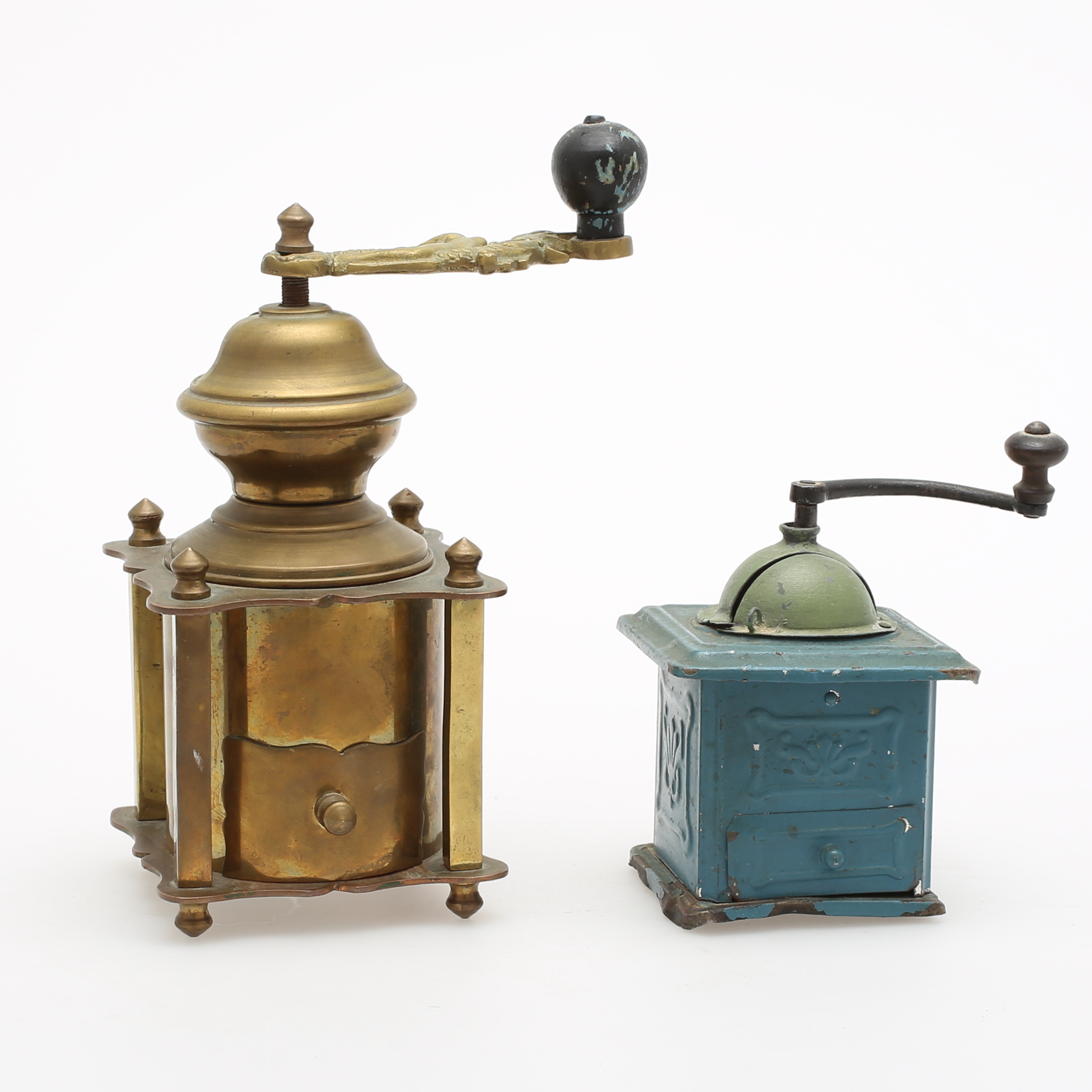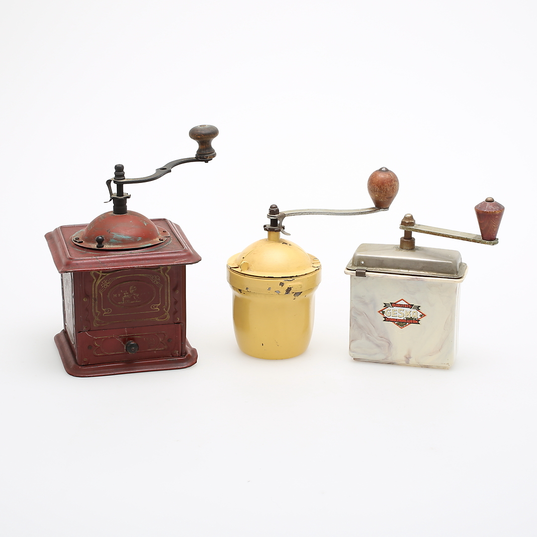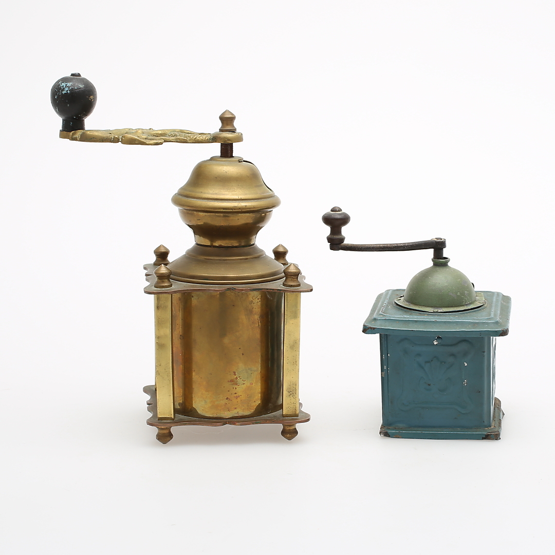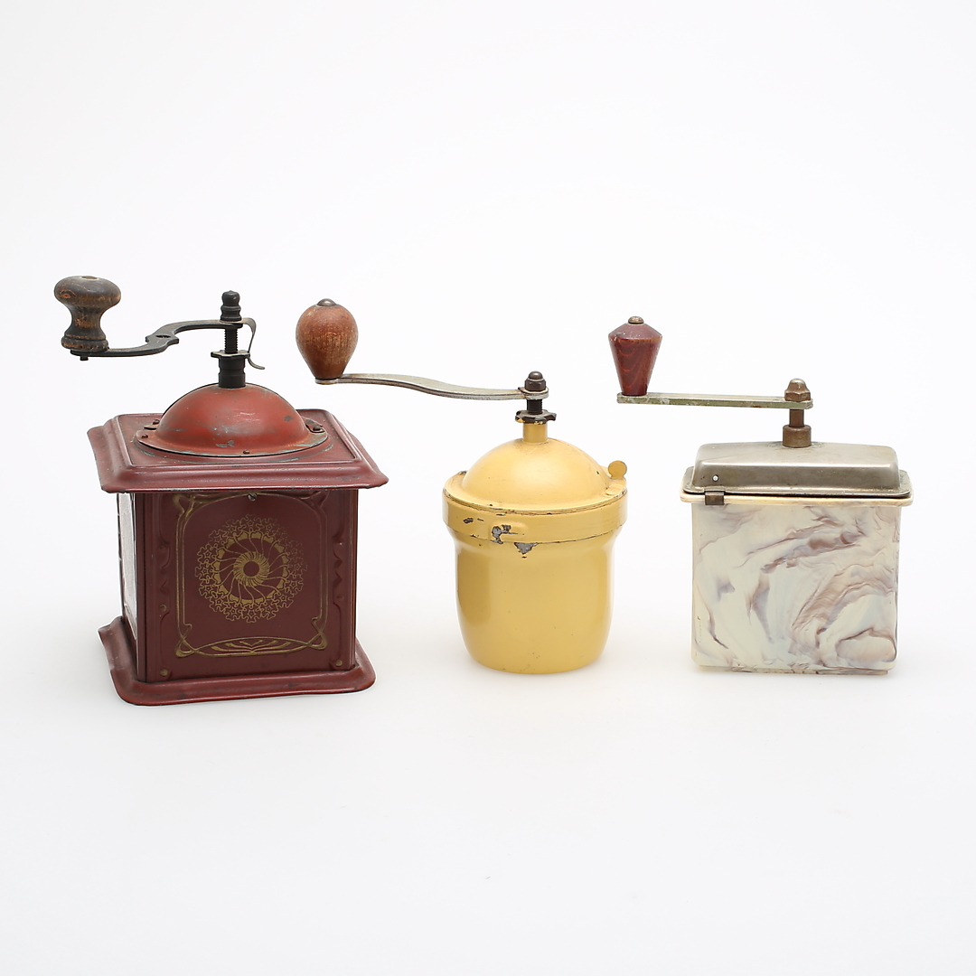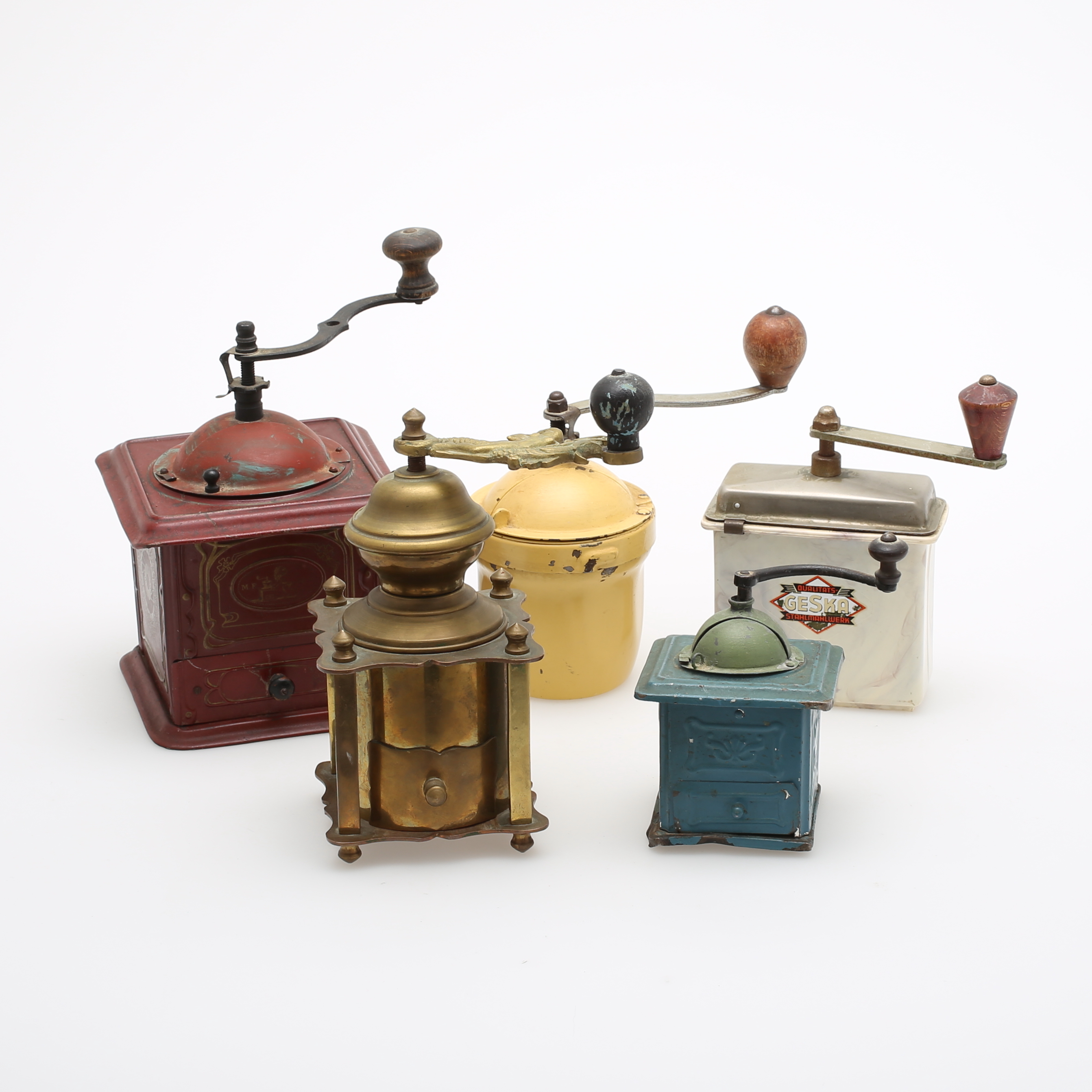 470043. KAFFEEMÜHLEN, 5 Stk., Bakelit, Messing, Zinn.