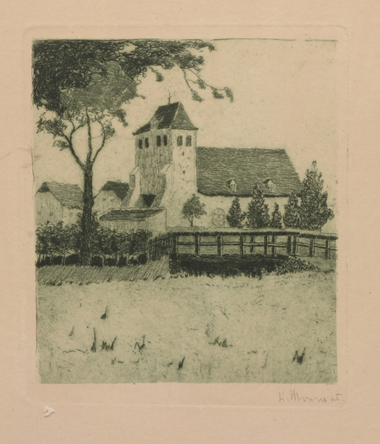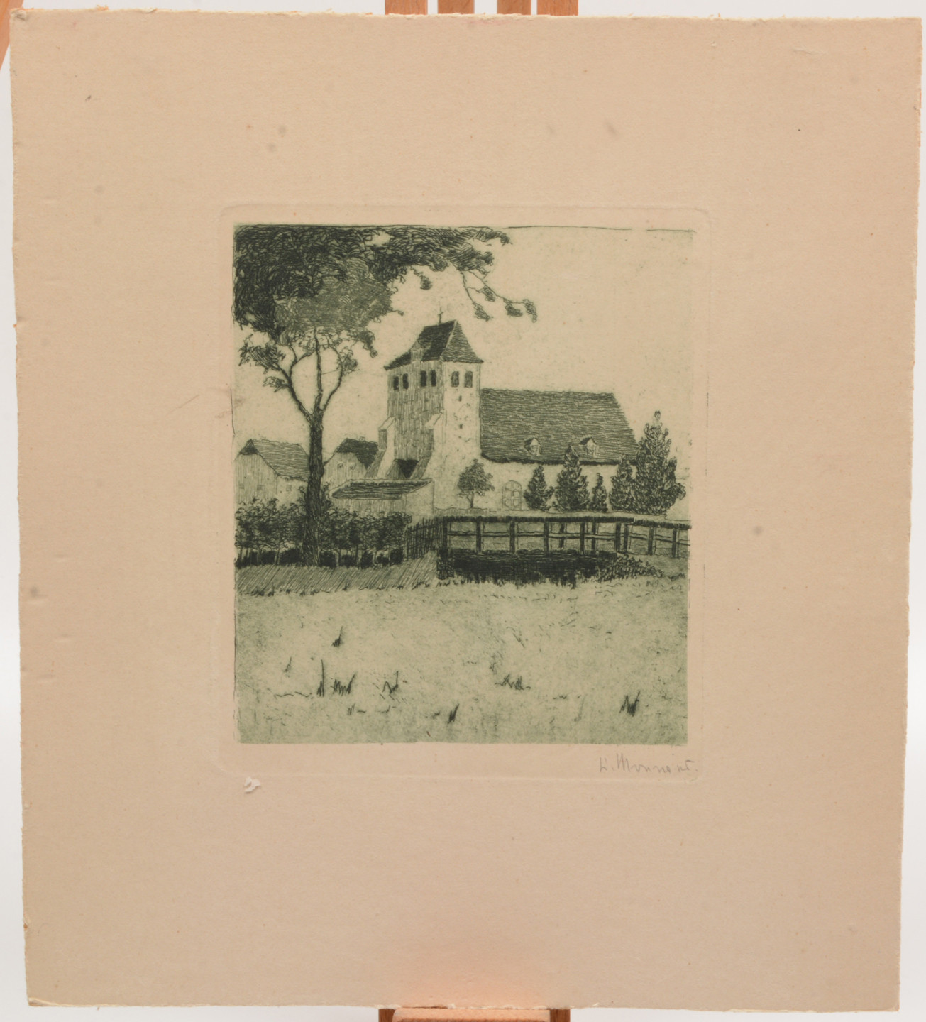 4721575. OIDENTIFIERAD KONSTNÄR. Radierung. Kirche und Brücke.
