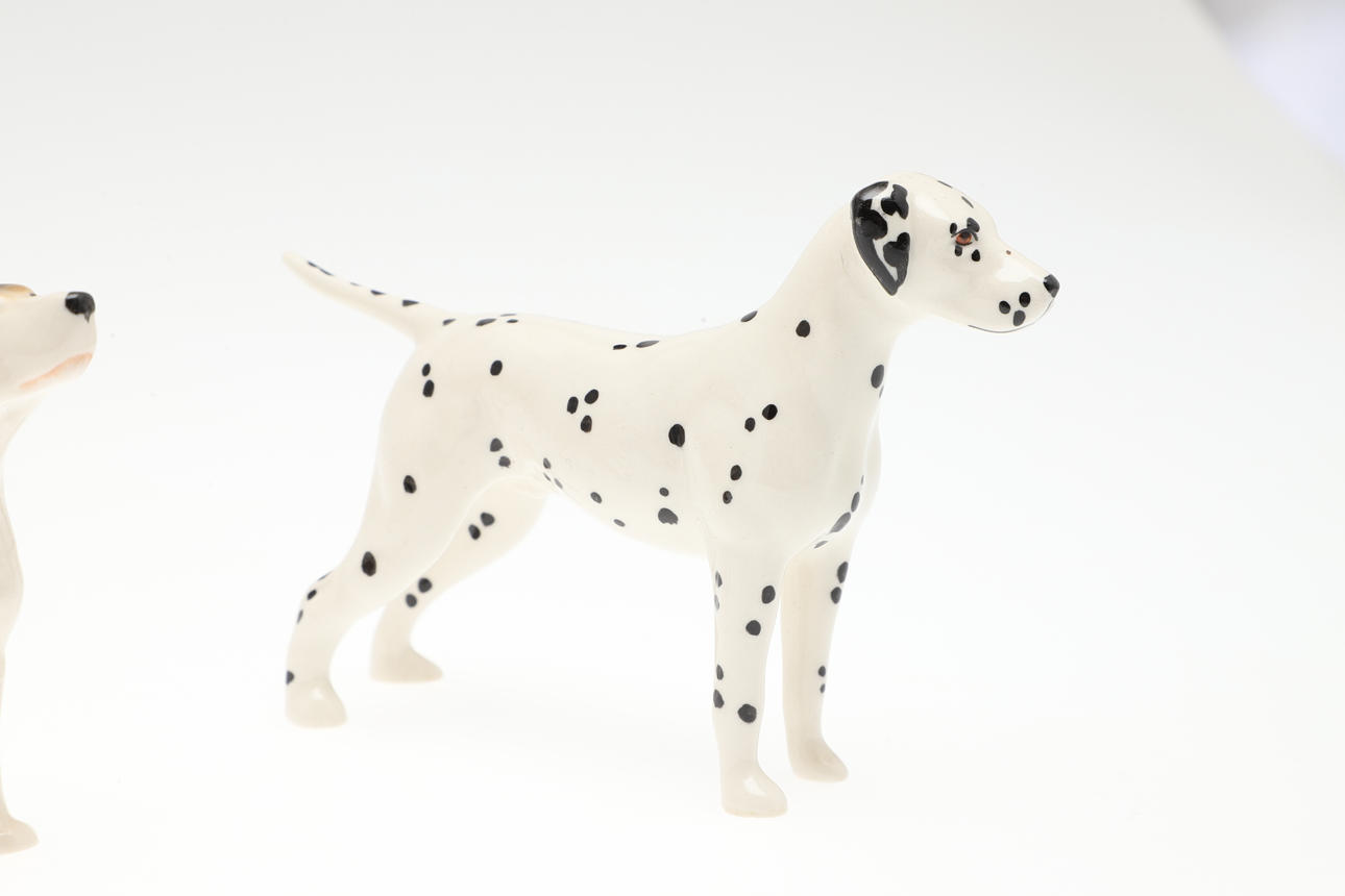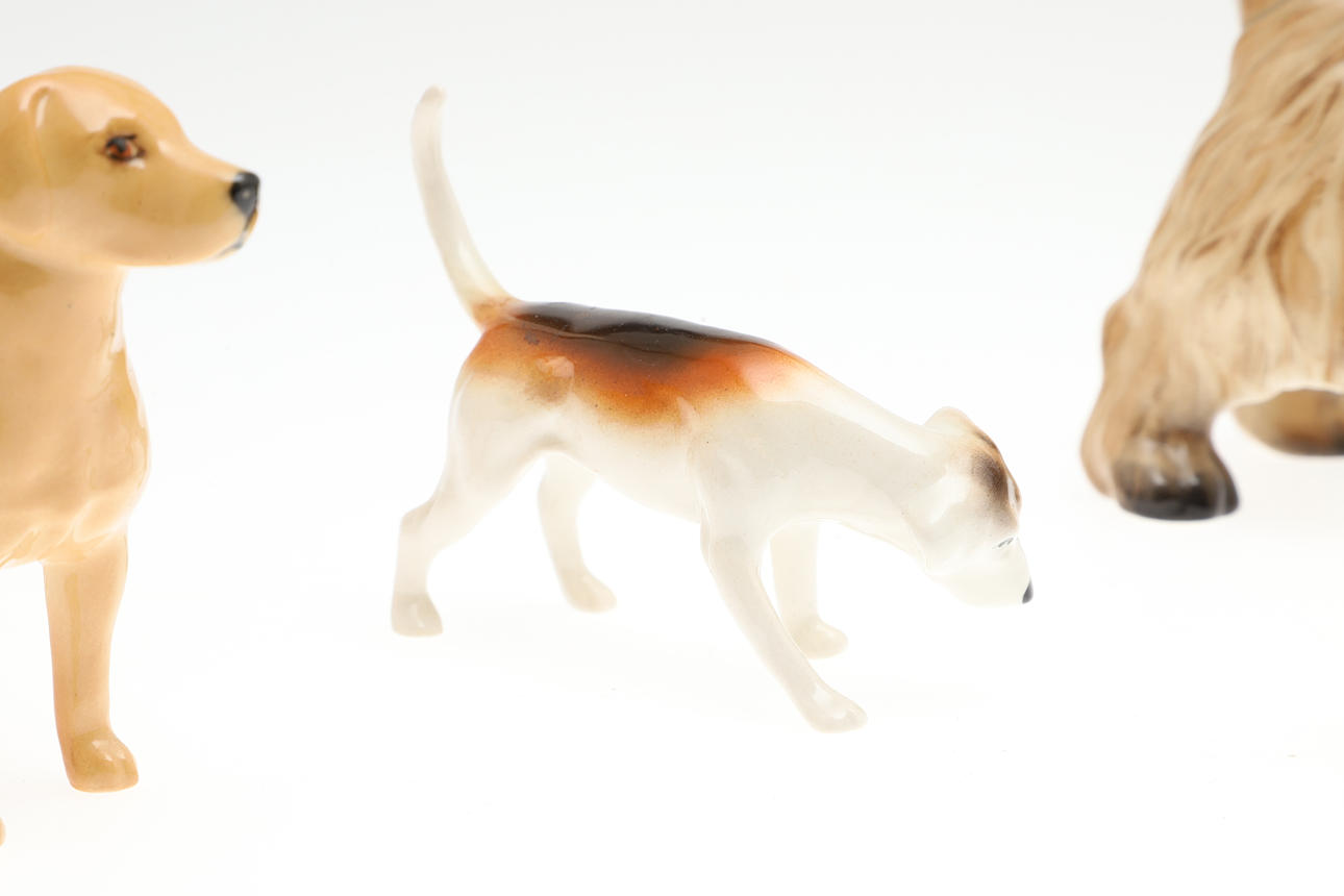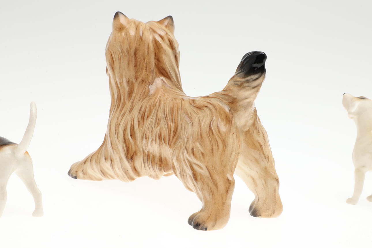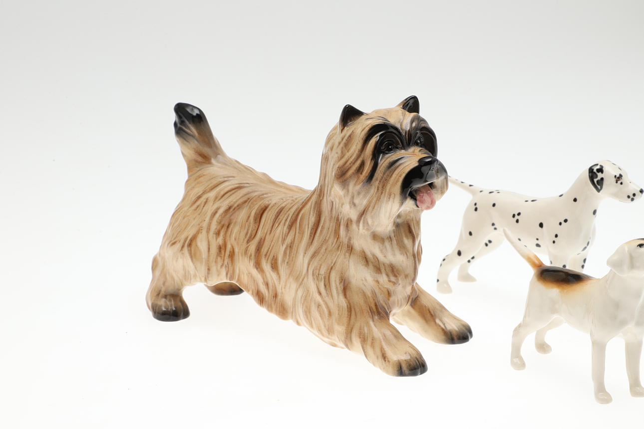 Fünf Beswick-Hundefiguren aus Keramik, darunter eine größere Cairn Terrier-Figur und vier kleinere Figuren verschiedener Rassen. Größe des größten: 12,5 cm (H) x 16 cm. (5).
