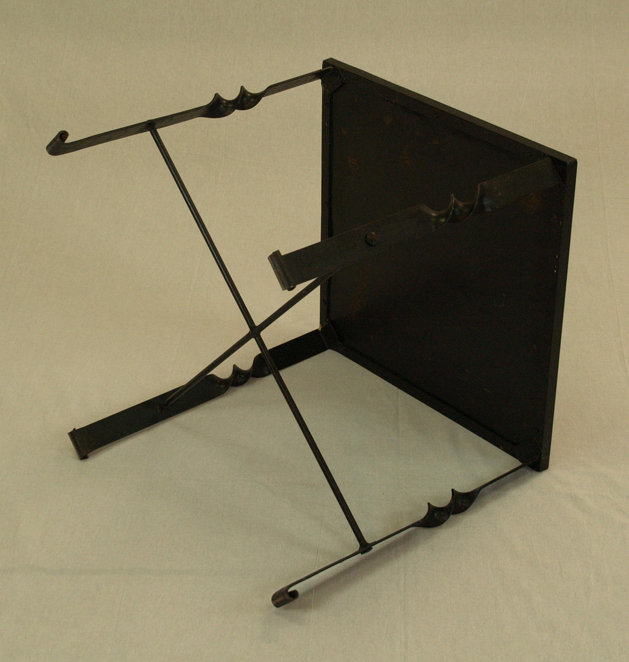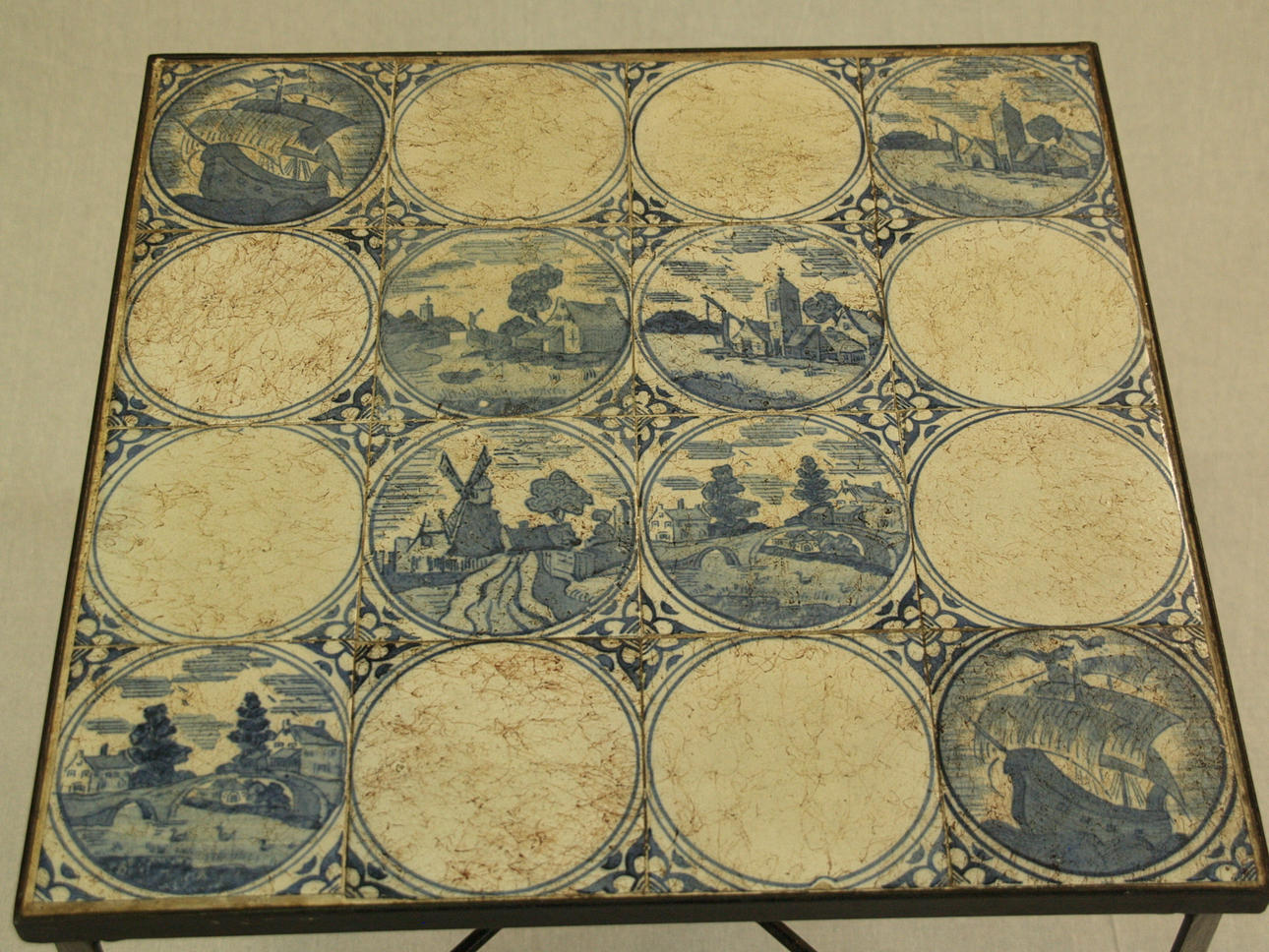 Platte aus 16 Kacheln mit Blaumalerei (Architektur-,Segelschiff-sowie Landschaftsmotive), geschmiedeter Eisenstand mit 4 querverstrebten partiell gewundenen Rollwerk-Beinen, H.ca.53cm, Platte ca.51,5x51,5cm.