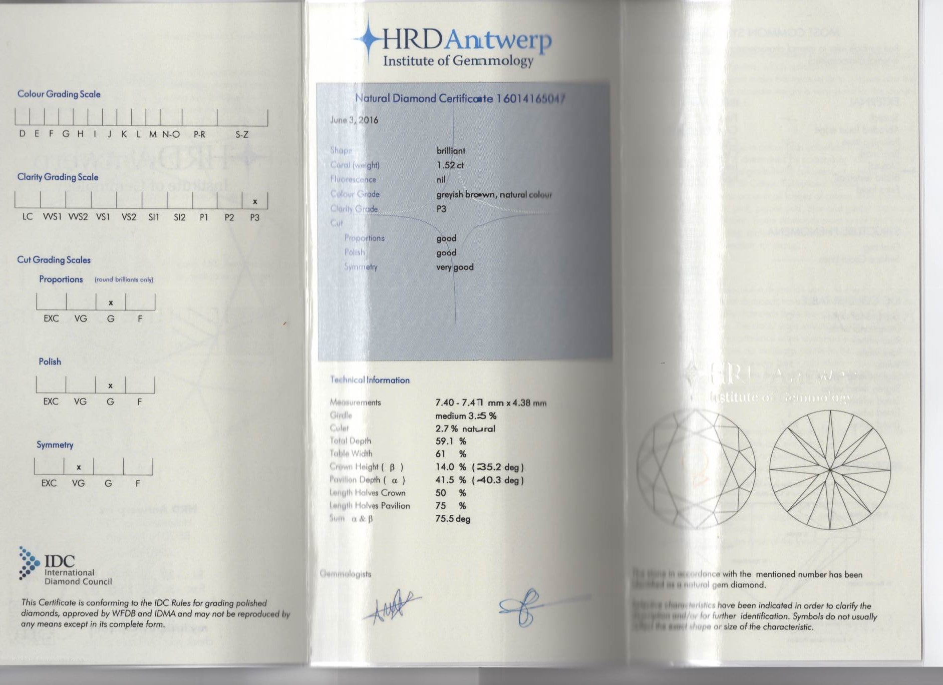 488500. Diamond, 1.52 CT. HRD Antwerp Certificete.
