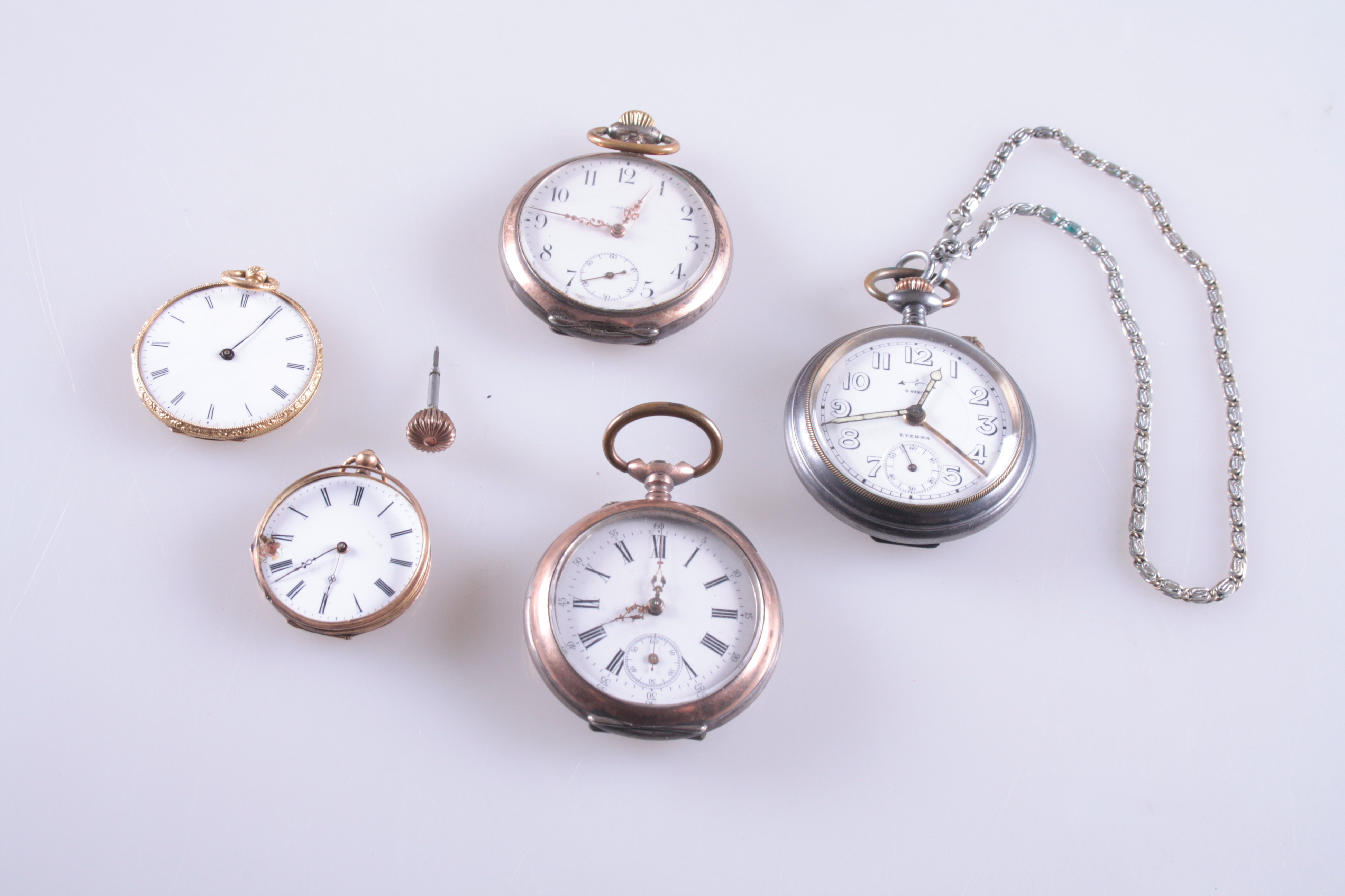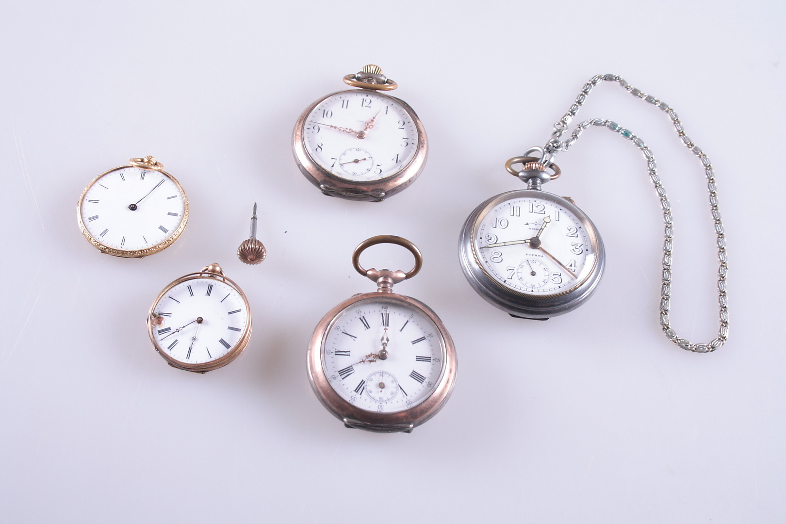 491624. TASCHENUHR, 5 Stück, Silber und Gold.