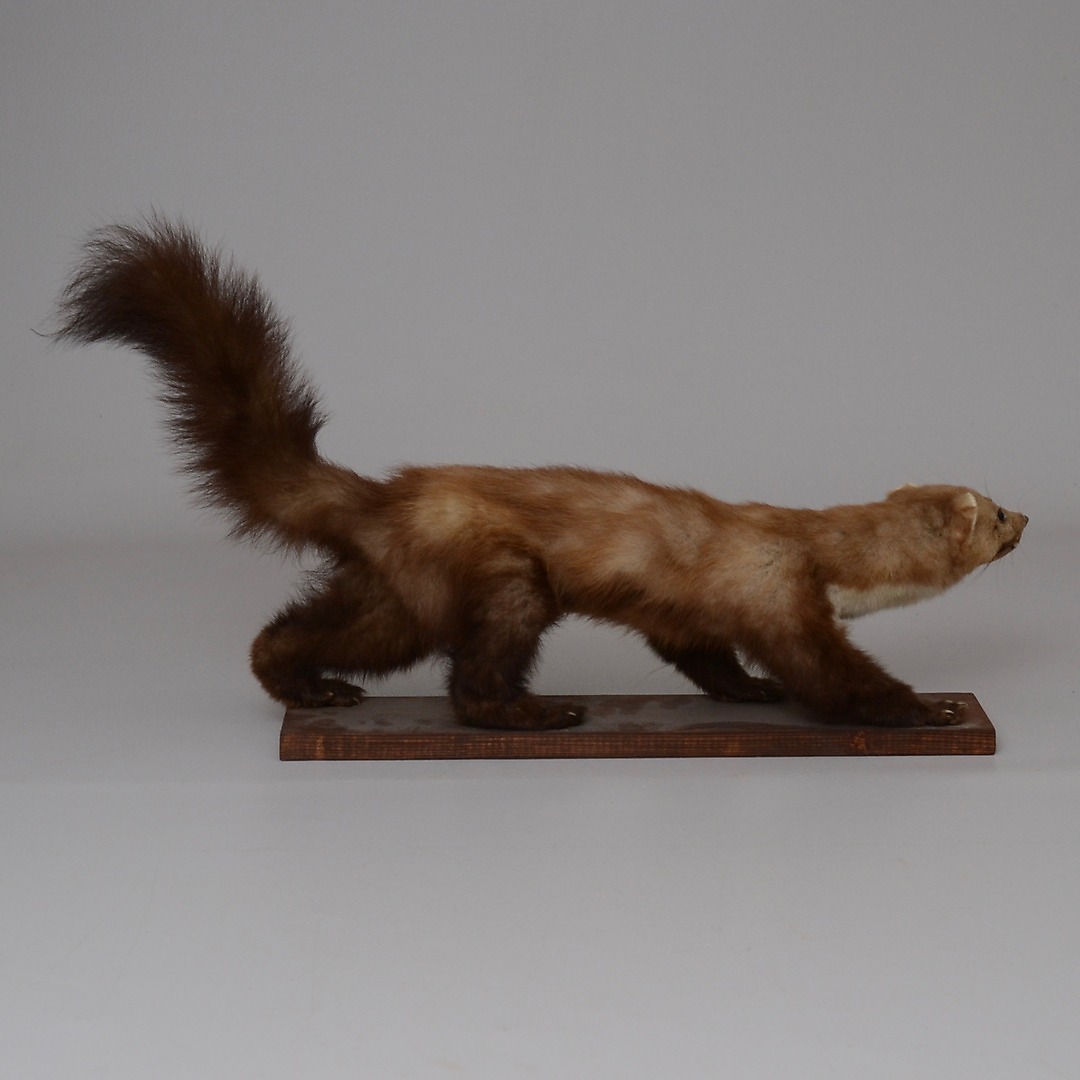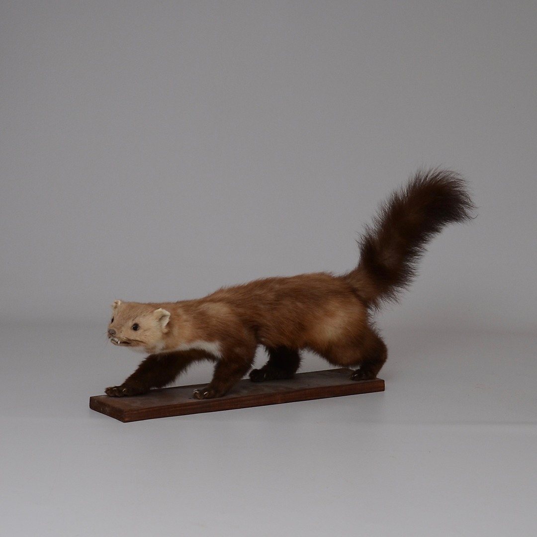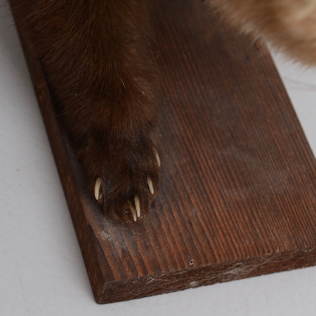 492832. MARTIN TIER, ausgestopft, auf Holzplatte montiert.