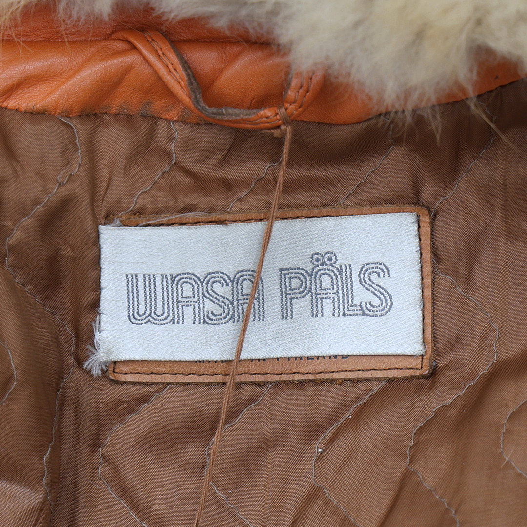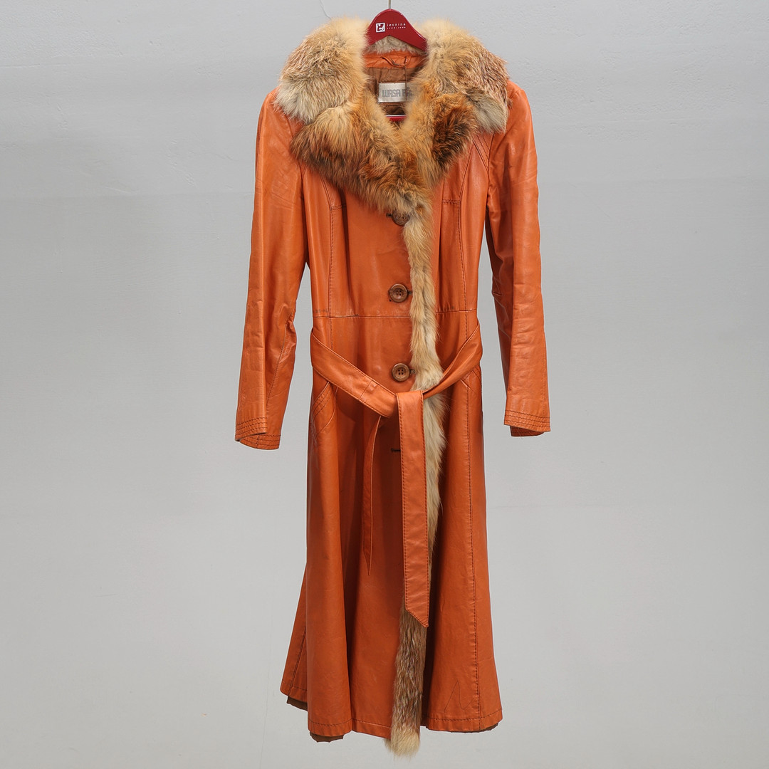 4988071. Ledermantel, roter Stoff mit Pelzkragen.
