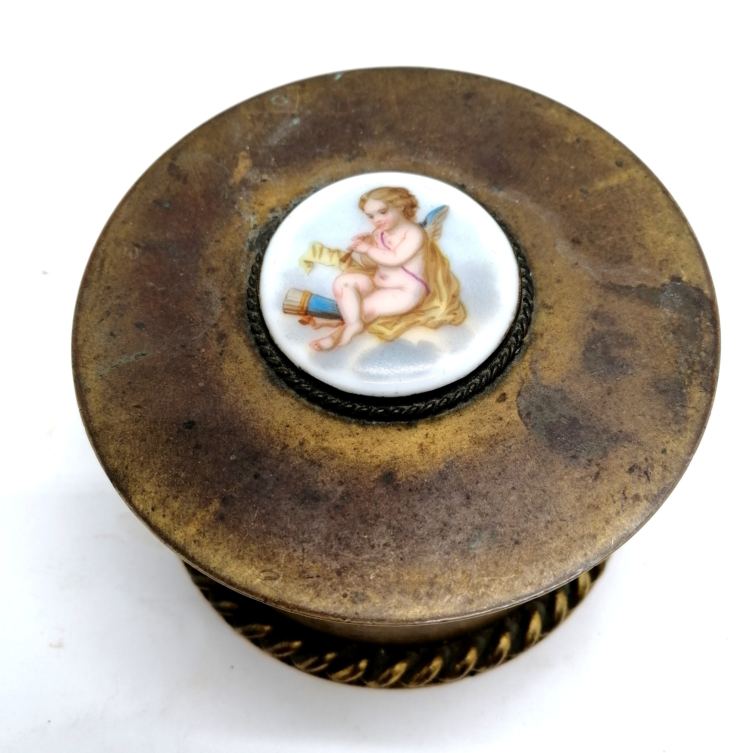 4990133. ANTIKE ORMOLU-MESSINGBOX MIT CHERUB-PORZELLANPLATTE.